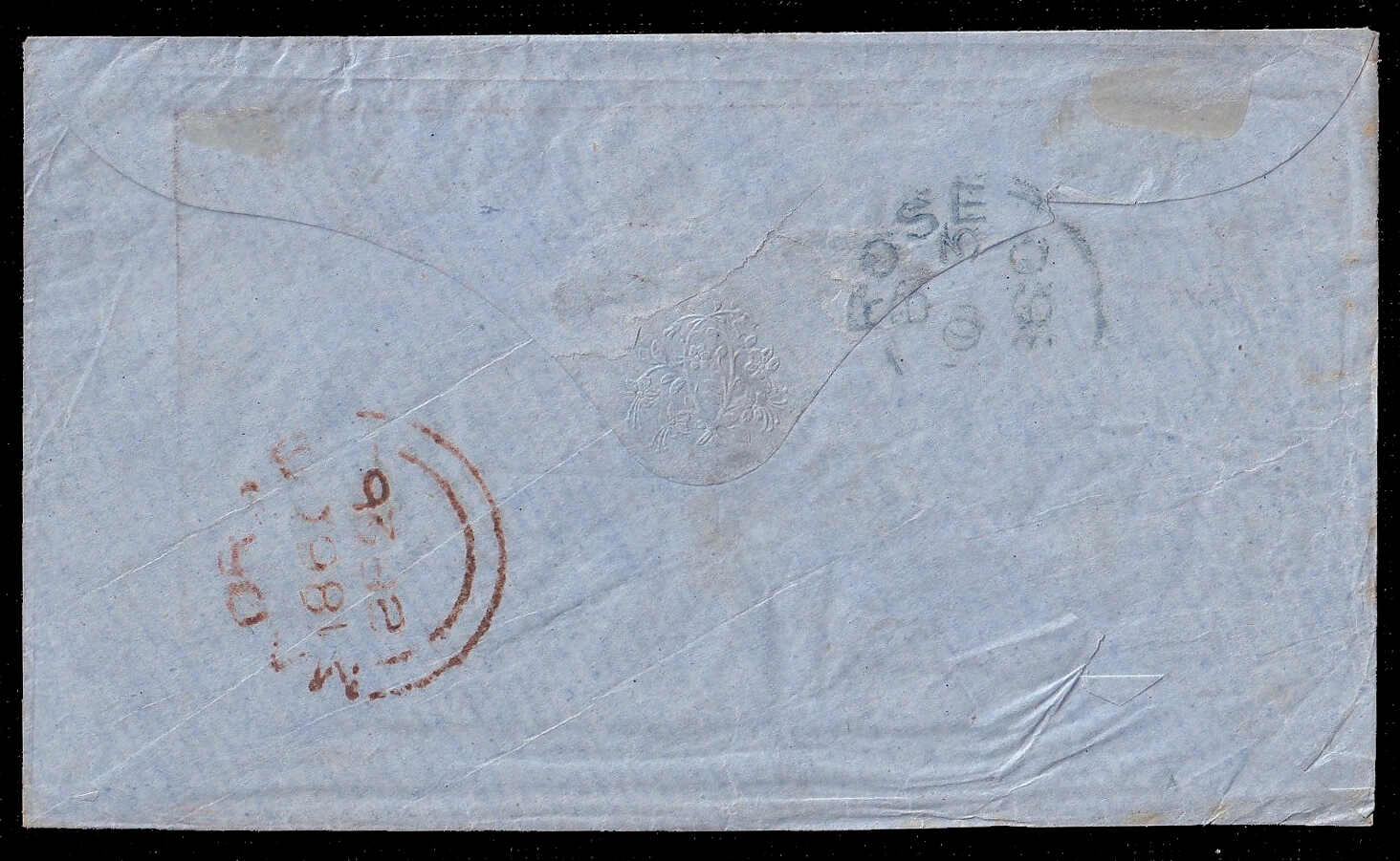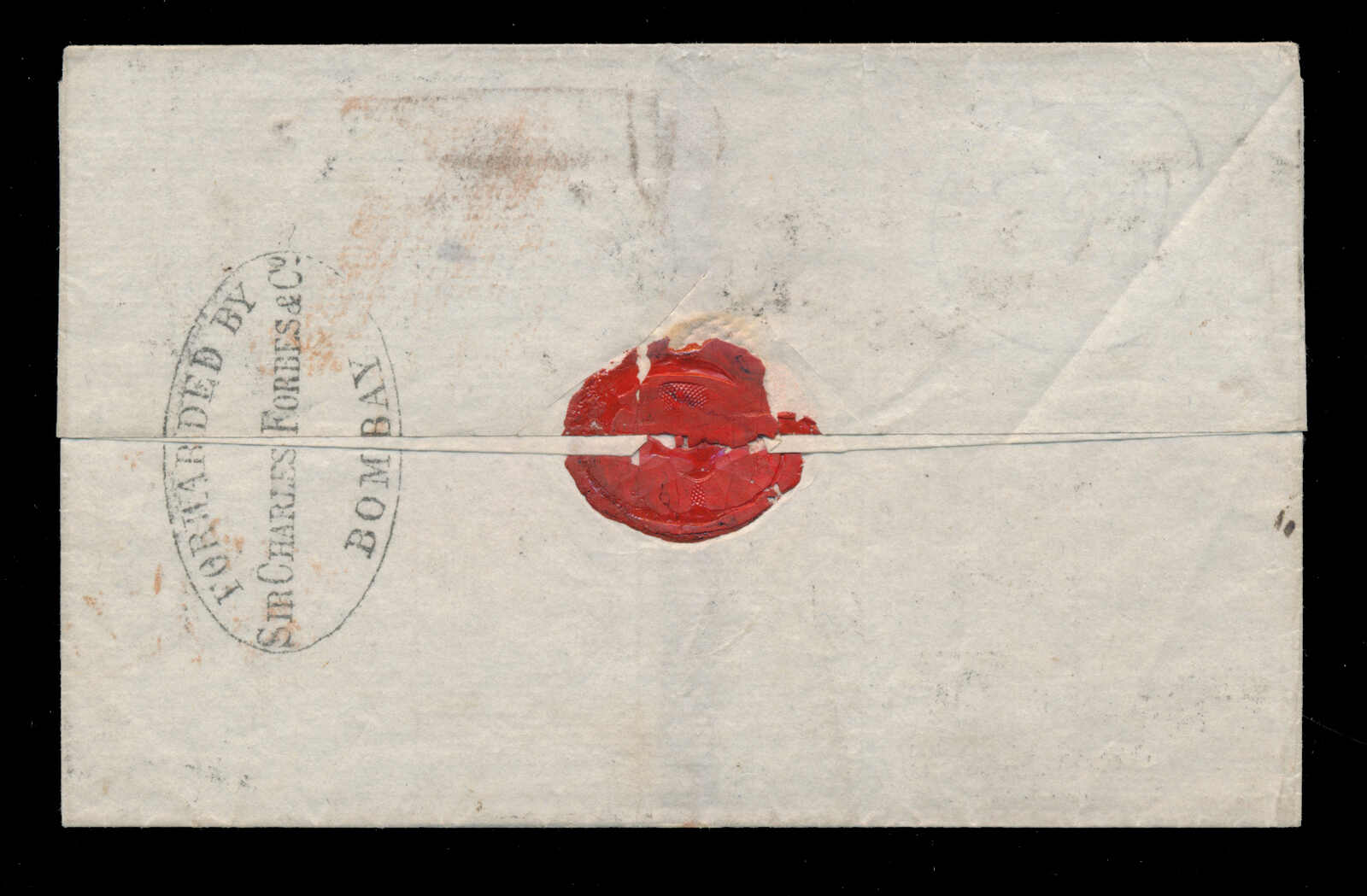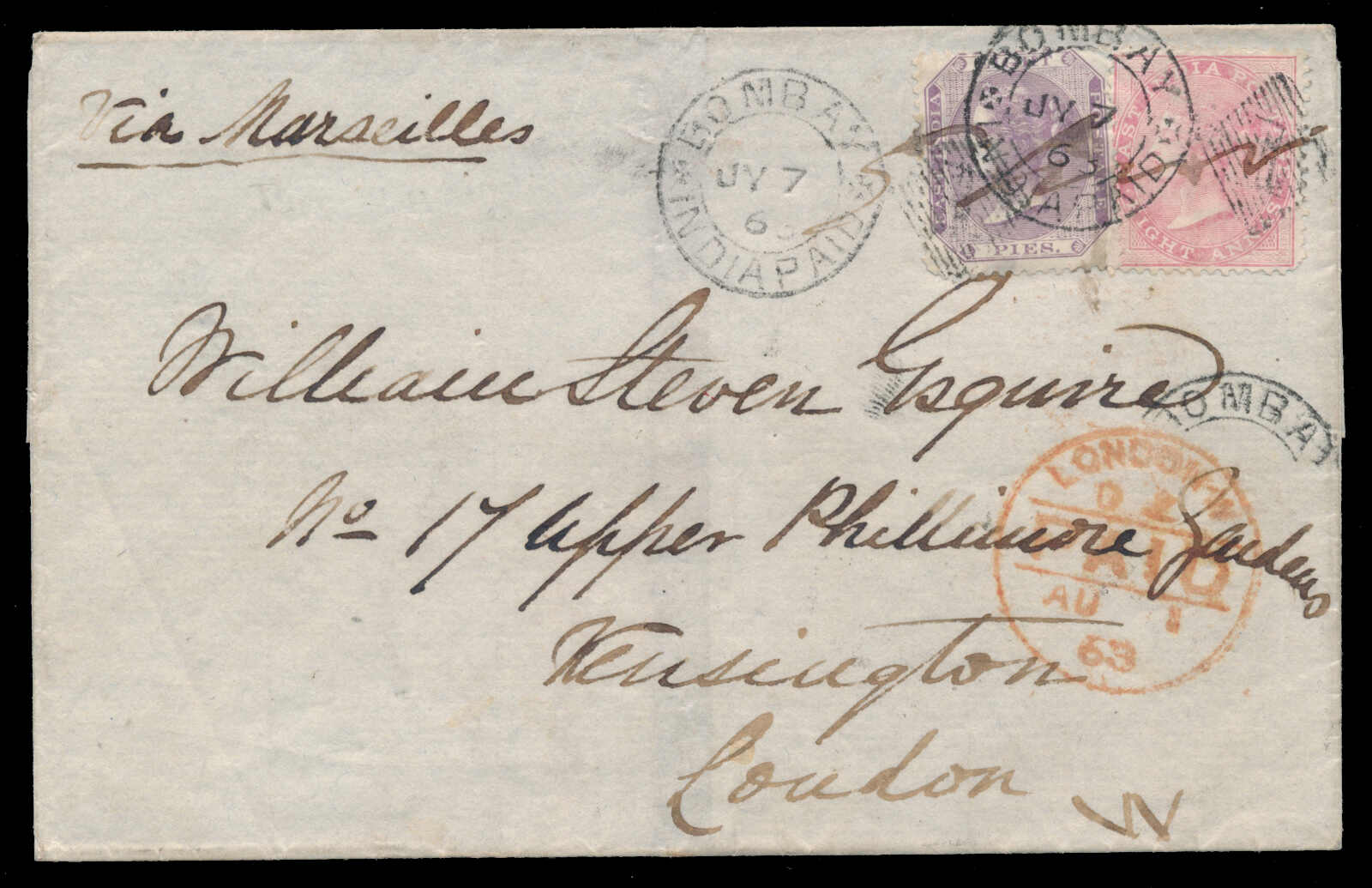 651 cover   image1863 (July 7), Bombay to London, Forwarded by Charles Forbes & Co, franked with 8p purple and 8a carmine, tied to folded cover to London by BOMBAY INDIA PAID '1' duplex, August 1 c.d.s. receiver on front, endorsed "via Marseilles", with clear oval "FORWARDED BY SIR CHARLES FORBES & CO BOMBAY" backstamp, lovely quality. (Image 1) (Image 2)