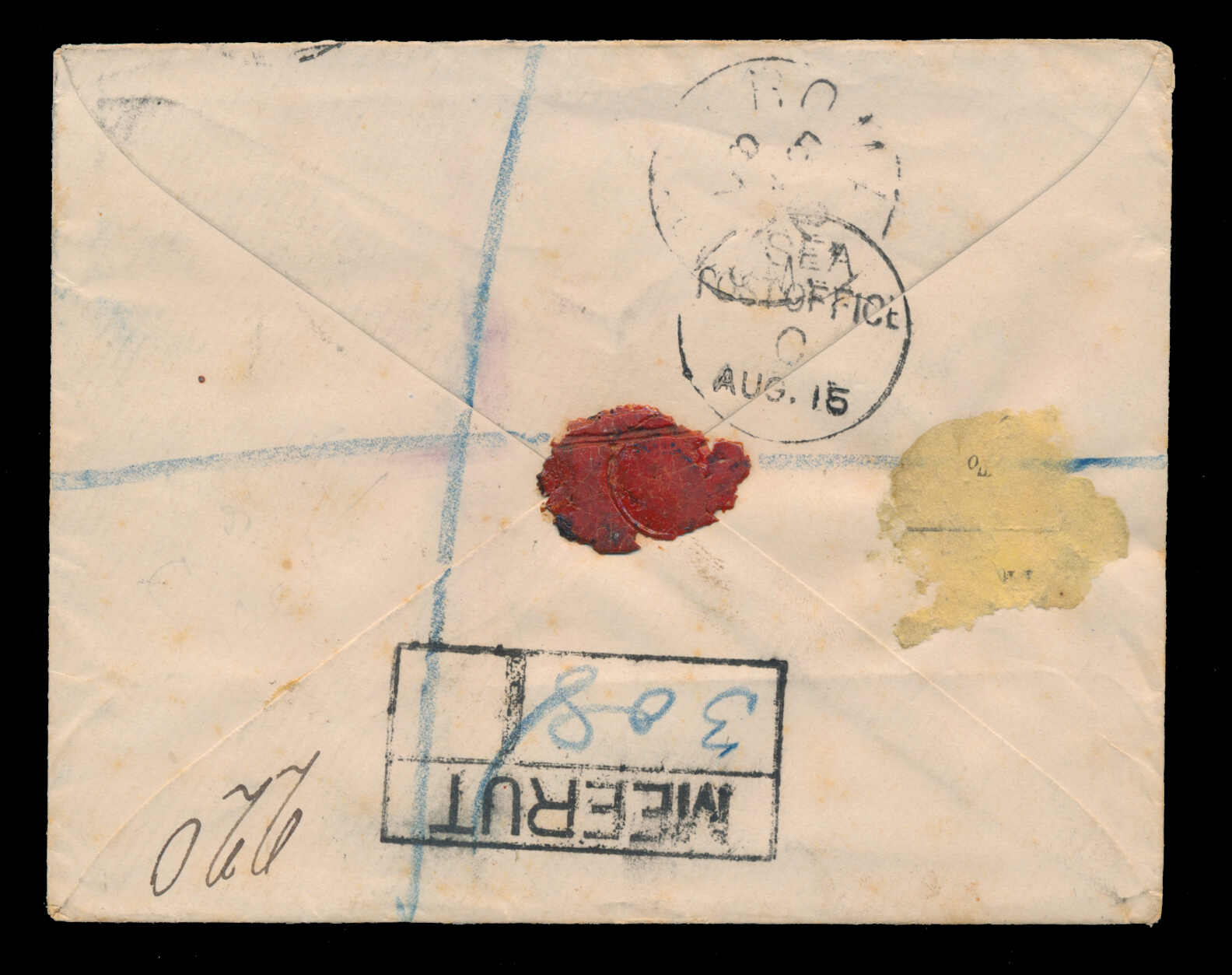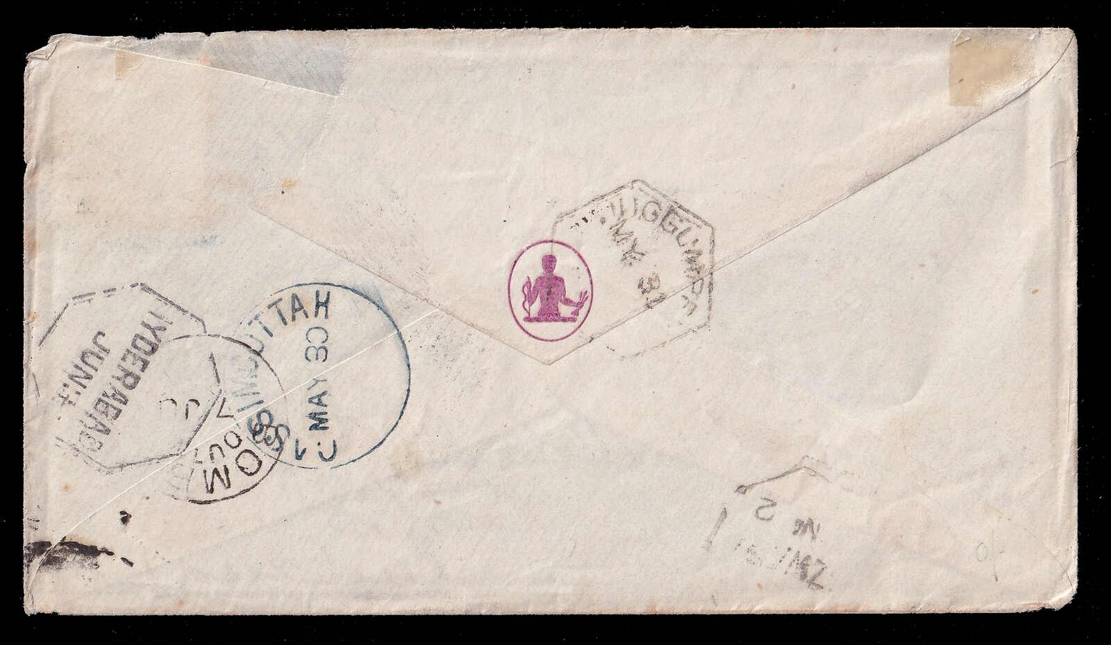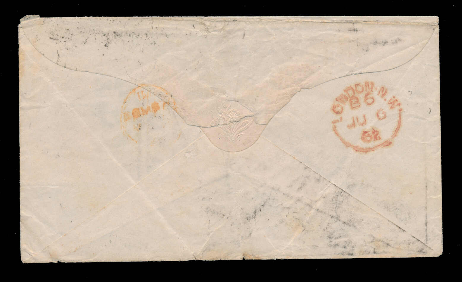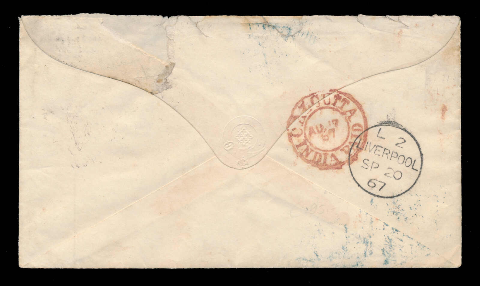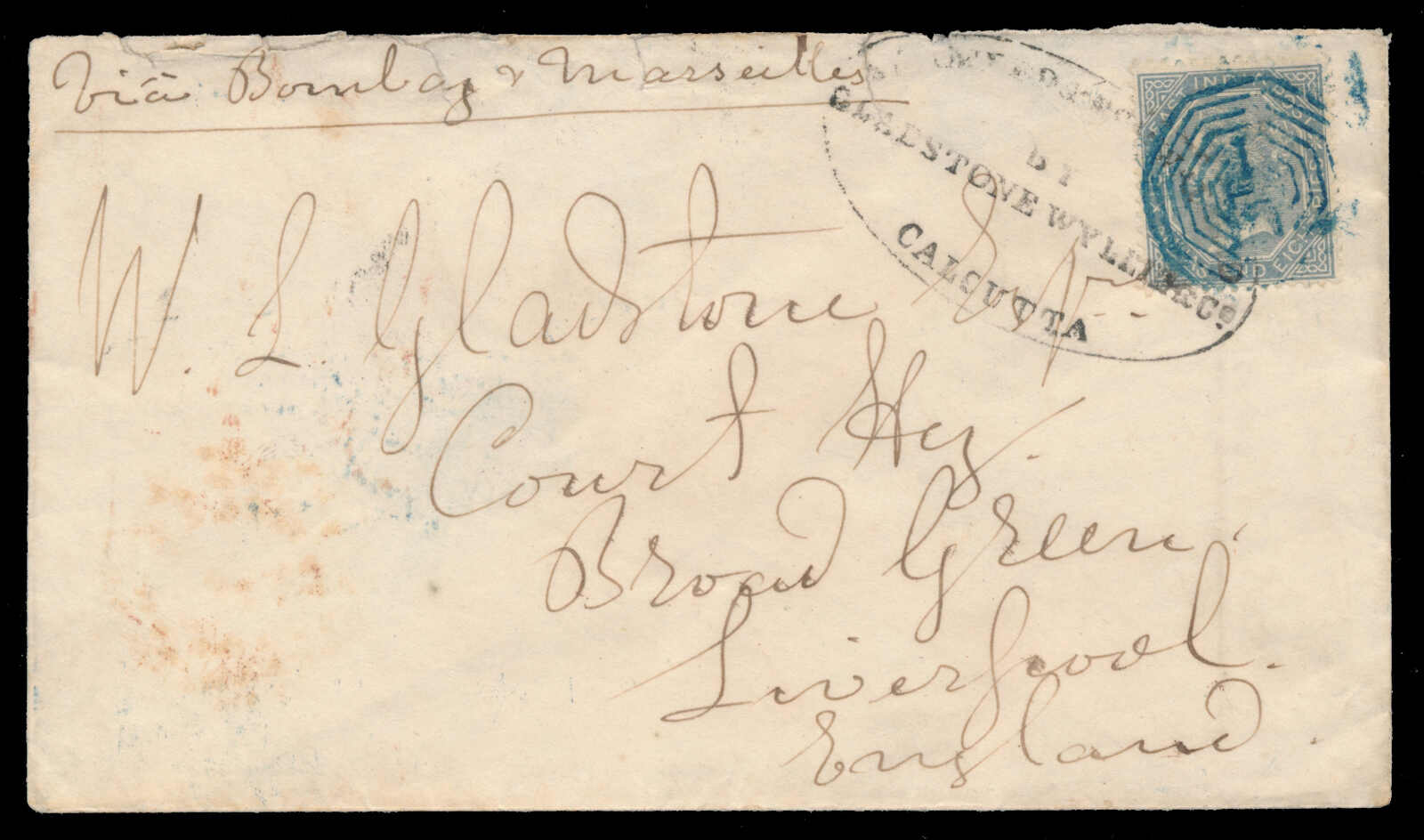 653 cover   image1867, Gladstone, Wyllie & Co, forwarding agent cover to Liverpool, franked with 6a8p slate, tied to cover by B/1 octagon of Bombay, oval GLADSTONE, WYLLIE & CO forwarding agent handstamp, to W.L. Gladstone in Liverpool, endorsed "Via Bombay & Marseilles", red "CALCUTTA AU 7 57 INDIA PAID" c.d.s. backstamp and Liverpool (20 Sep) receiver, small opening tears to back flap, else fresh and fine-very fine, and a quality strike of the forwarder's cachet. (Image 1) (Image 2)
