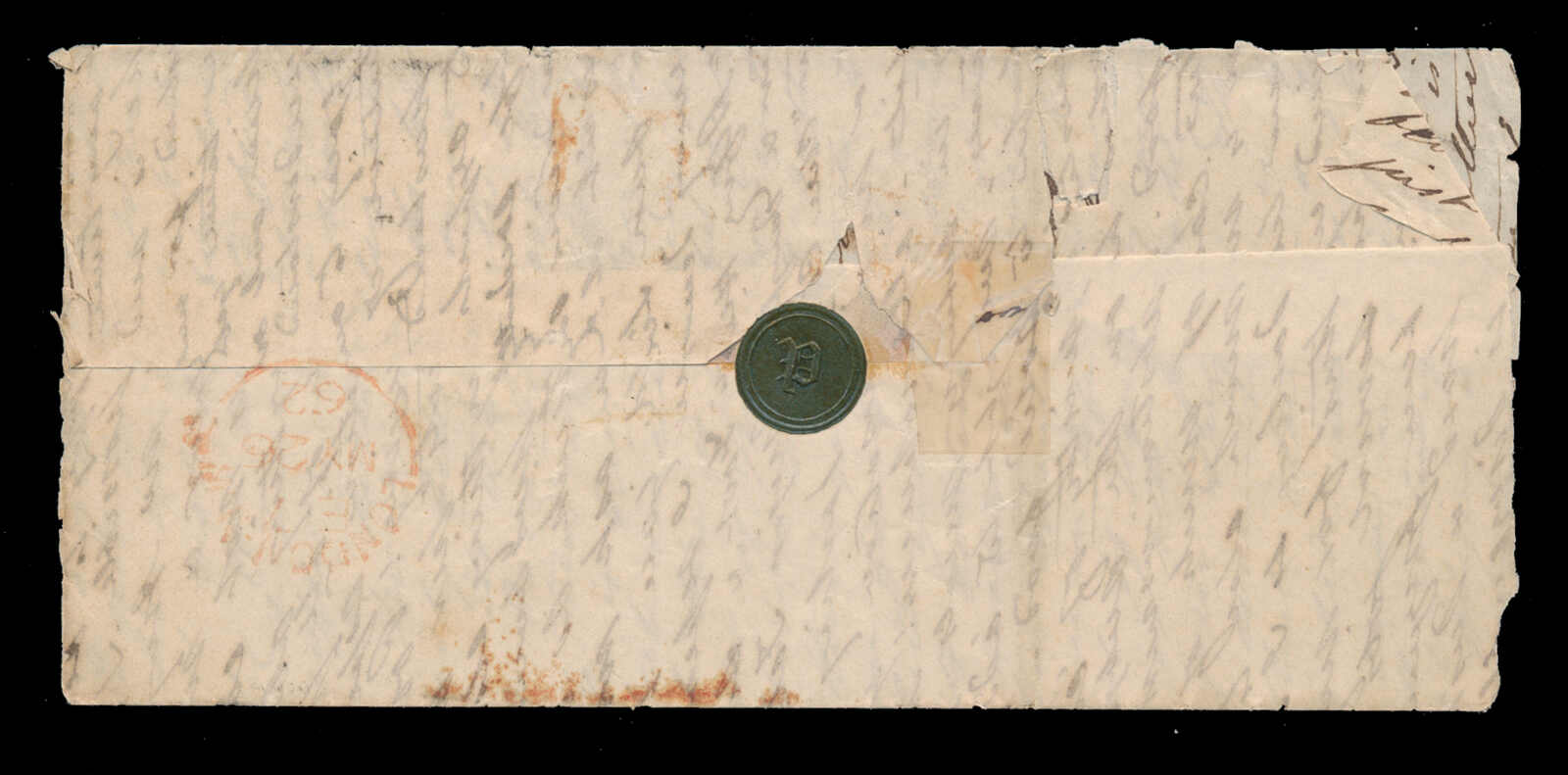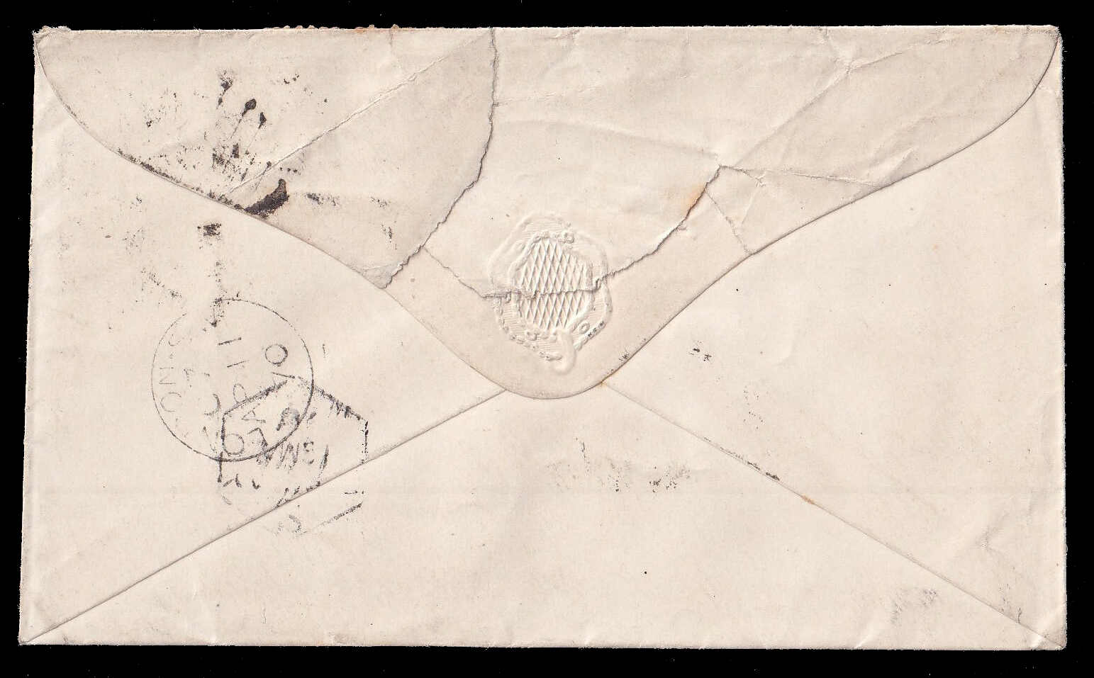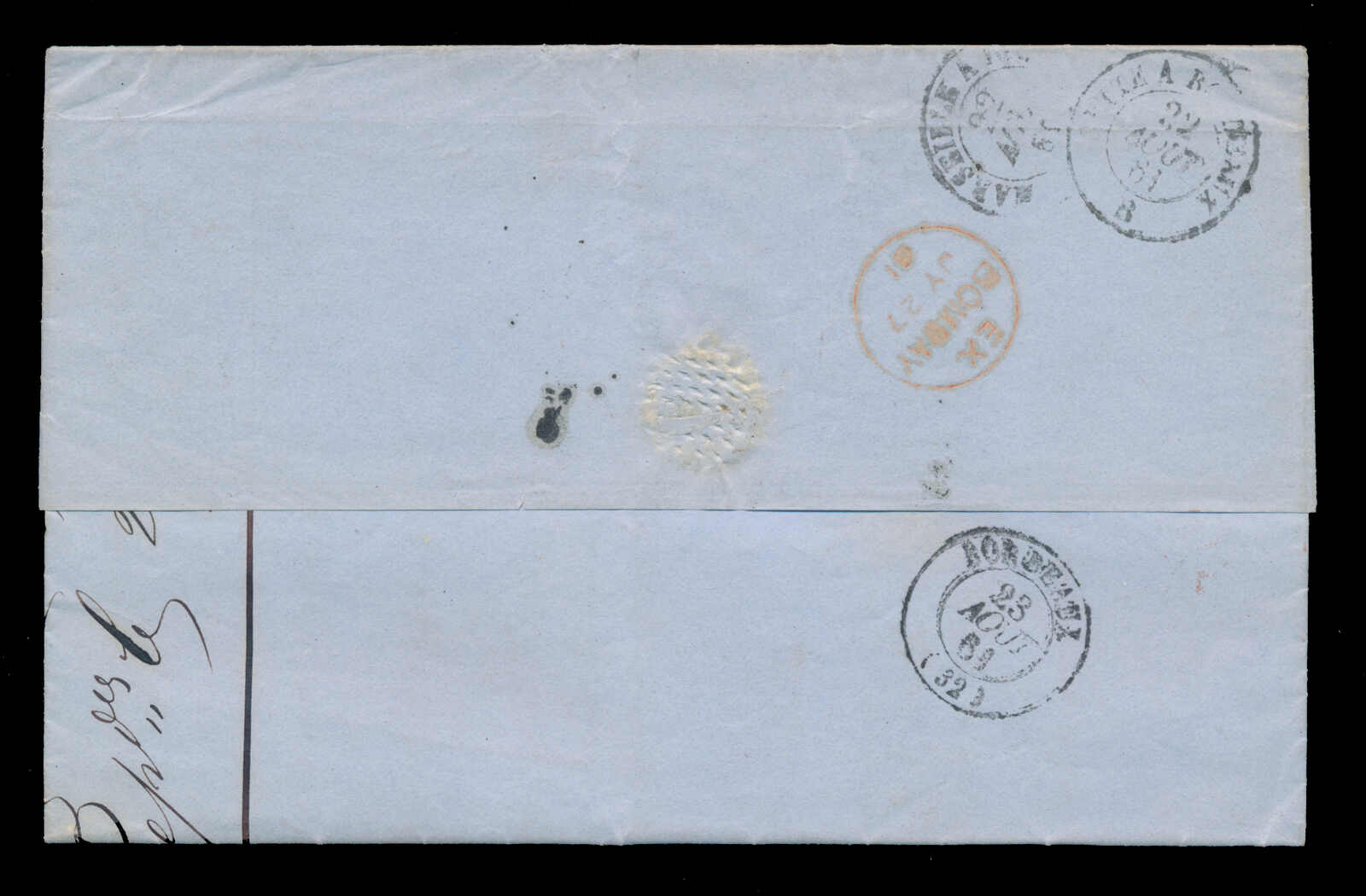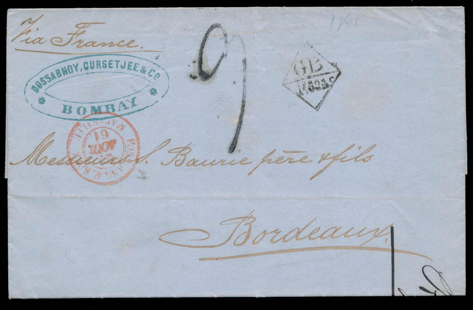 646 cover   image1861 (27 July), Bombay to Bordeaux, stampless folded letter, with red "EX BOMBAY JY 27 61" c.d.s., rated "9" in black with GB diamond accountancy mark, "“POSS. ANG. V. SUEZ/A MARSEILLE 22 NOV 61" c.d.s., two French TPO transit backstamps and Bordeaux (23 Aug) receiver, some light wrinkling, a fresh and fine letter to France. (Image 1) (Image 2)