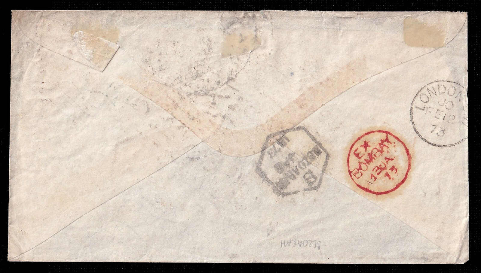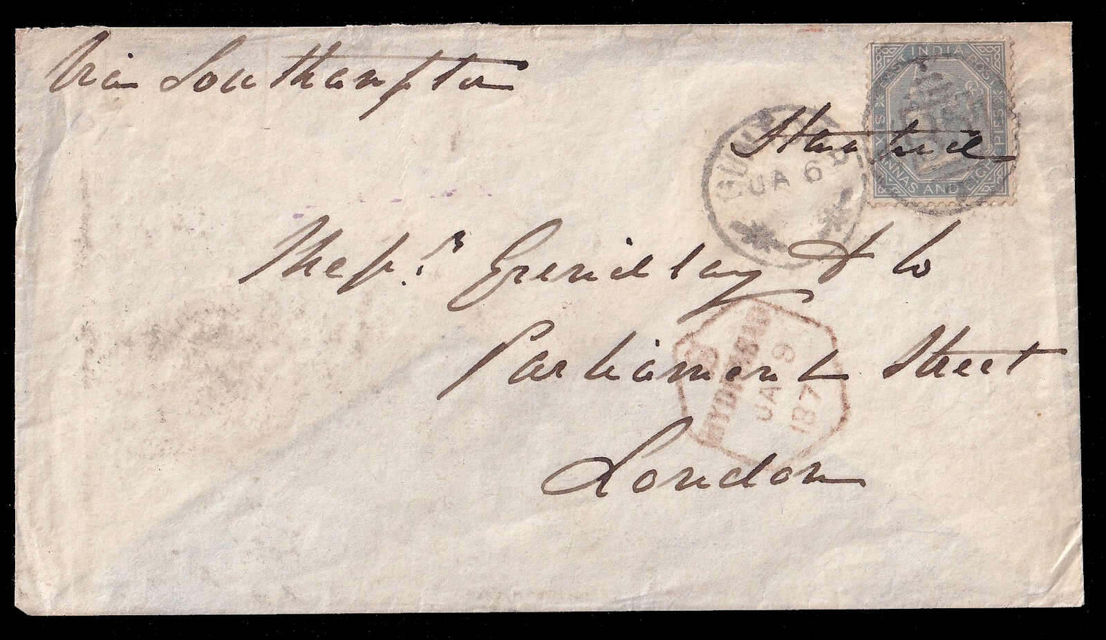 656 cover   image1873 (January 6), Guntoor to London, envelope franked with single 6a 8p slate Queen Victoria, tied by Guntoor '35' duplex (Cooper Type 9) and manuscript "Stamped", endorsed "Via Southampton", showing brown-red hexagonal Hyderabad datestamp, hexagonal Bezorah (8 Jan) transit and red Bombay (13 Jan) transit, with London S.W. (12 Feb) receiver on reverse; light wrinkles, an elusive cancellation. (Image 1) (Image 2)