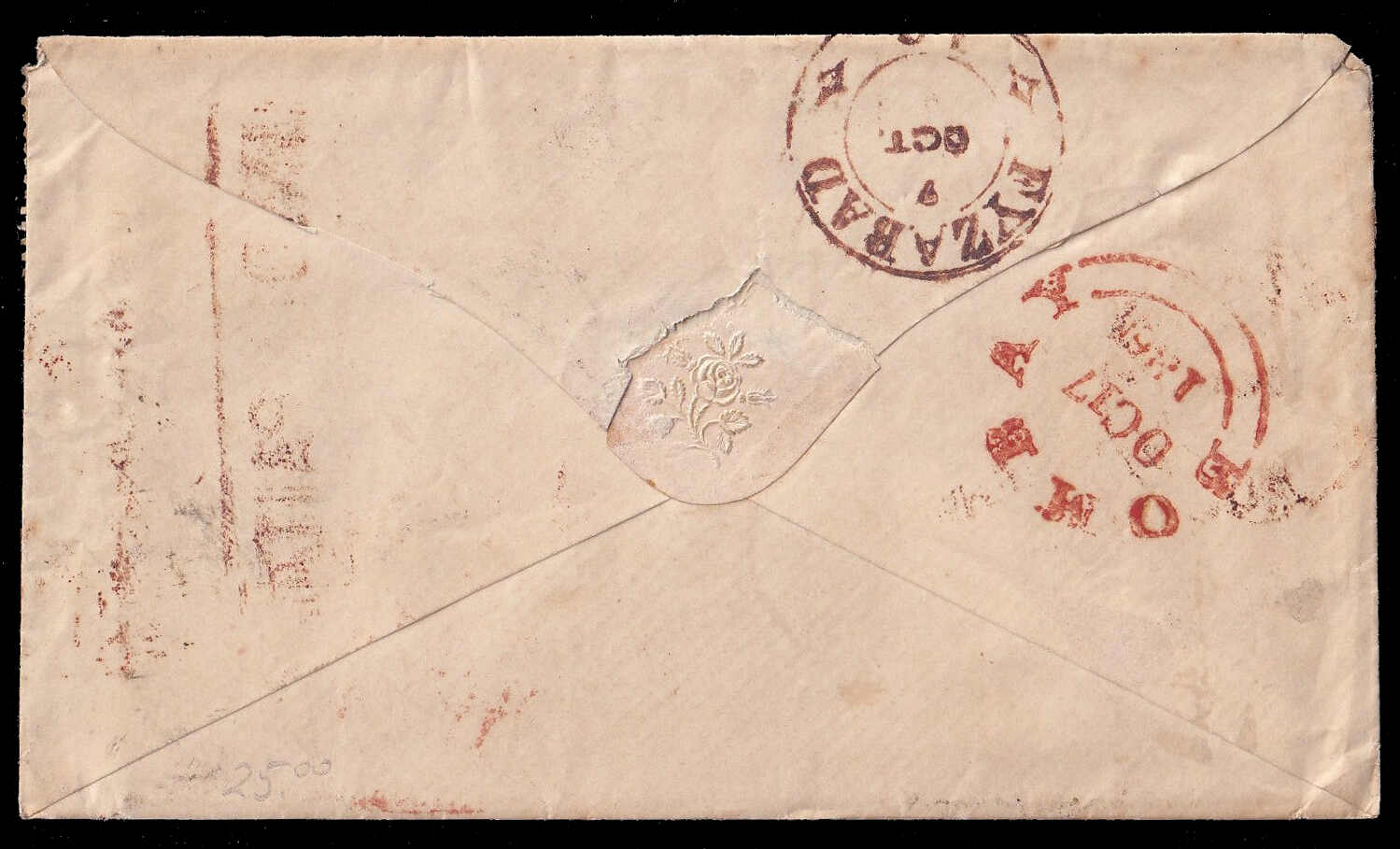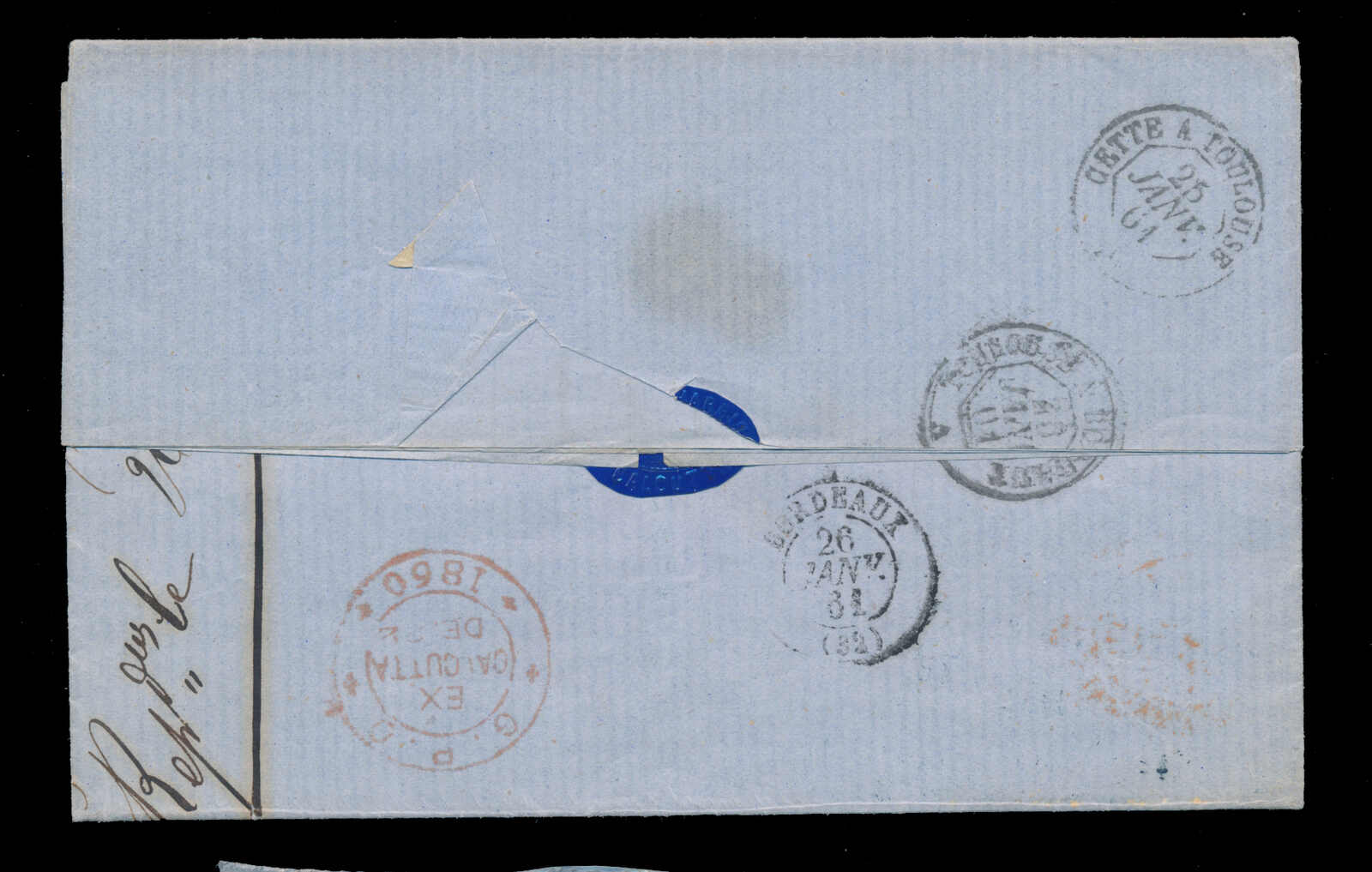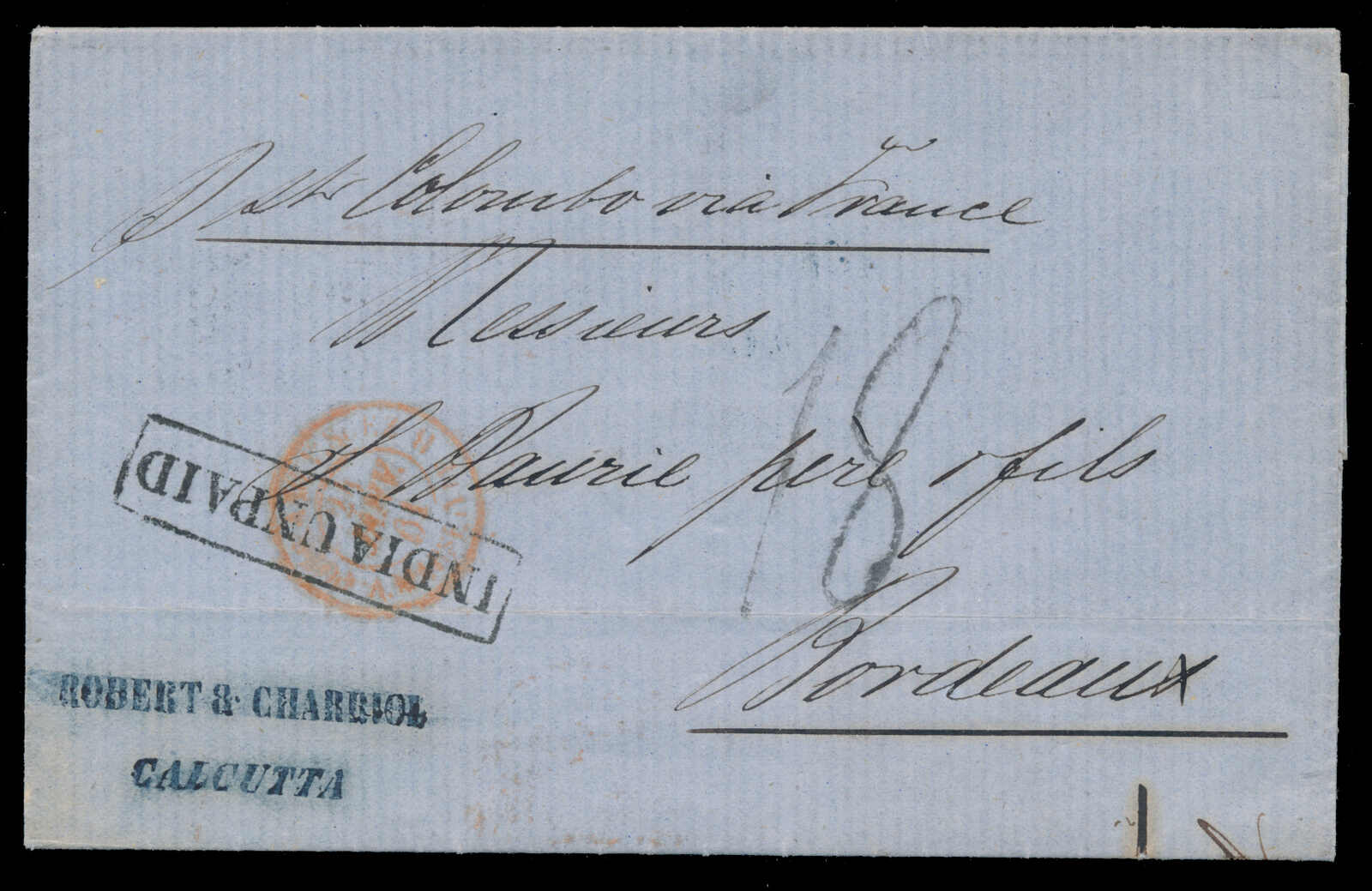 643 cover   image1860 (21 December), Calcutta to France, unpaid, stampless folded letter, datelined Calcutta, with red "G.P.O. EX / CALCUTTA / DE 22 1860" b/s, rated '18' in black, to Bordeaux, France, boxed INDIA UNPAID, endorsed "P. Str. Colombo via France" in manuscript, with "Cette A Toulouse" (25 Jan) and next-day "Toulouse a Bordeaux" TPO transit backstamps, Bordeaux c.d.s. receiver, a pleasing cover. (Image 1) (Image 2)