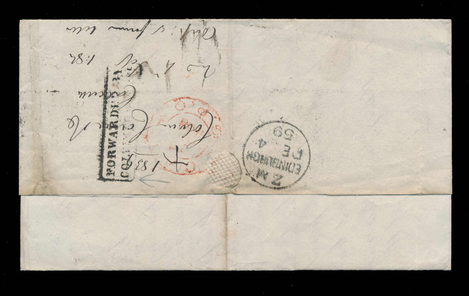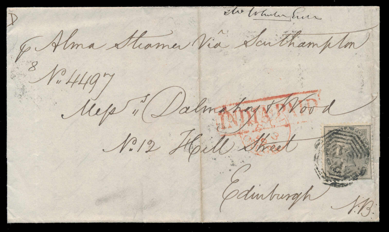 642 cover   image1859, 4a grey black, tied to folded letter by "B/1" octagon, forwarded by Colvin, Cowie & Co, handstruck "INDIA PAID" and "PAID LONDON" (Feb 3) in red on front, to Edinburgh, endorsed "P. Alma Steamer via Southampton", partial boxed "FORWARDED BY / COLVIN, COWIE & CO", with red "CAL G.P.O." and black Edinburgh c.d.s. backstamps, vertical filing folds, fine. (Image 1) (Image 2)
