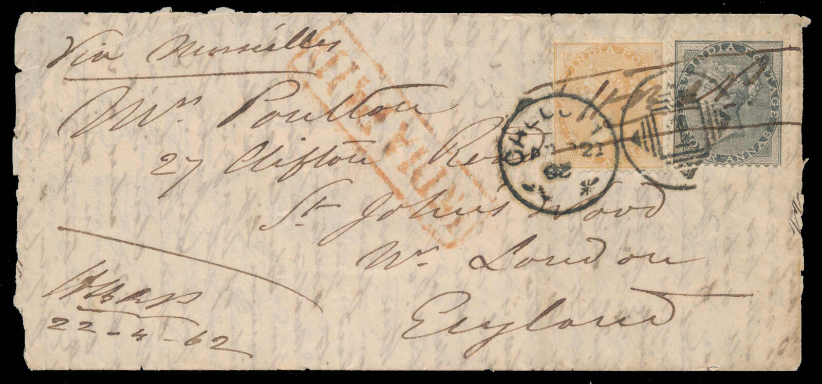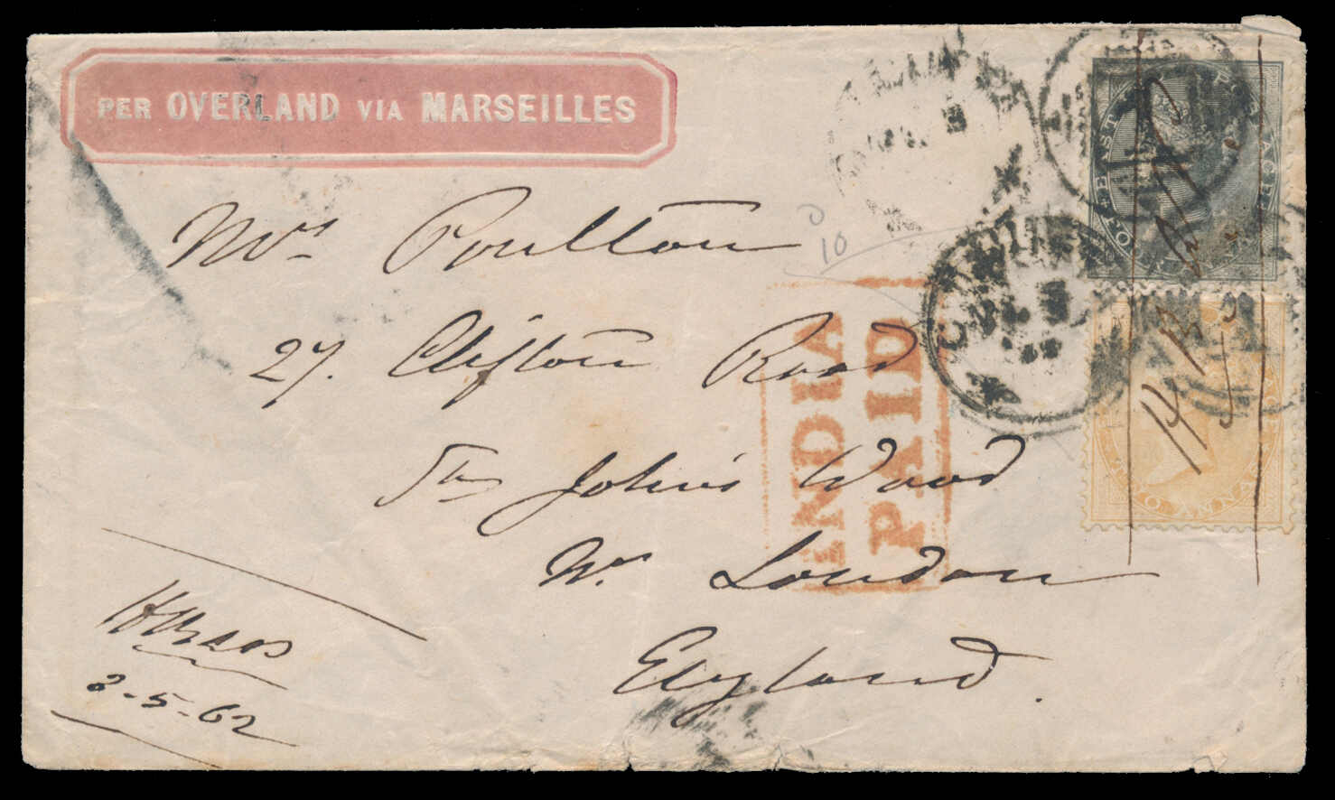 649 cover   image1862, 2a orange and 4a black, Calcutta to London, Overland via Marseilles, both stamps tied to cover by "Calcutta '1'" duplex, handstruck "INDIA / PAID" in red, embossed rose "PER OVERLAND VIA MARSEILLES" endorsement at upper left, June 6 split-ring arrival backstamp, some creasing, an uncommon printed banner directive. (Image 1) (Image 2)