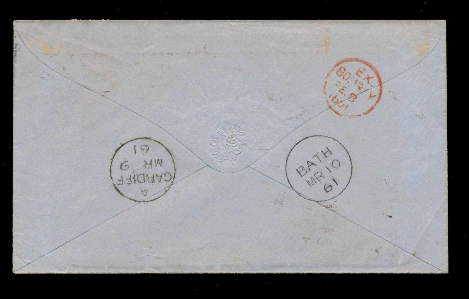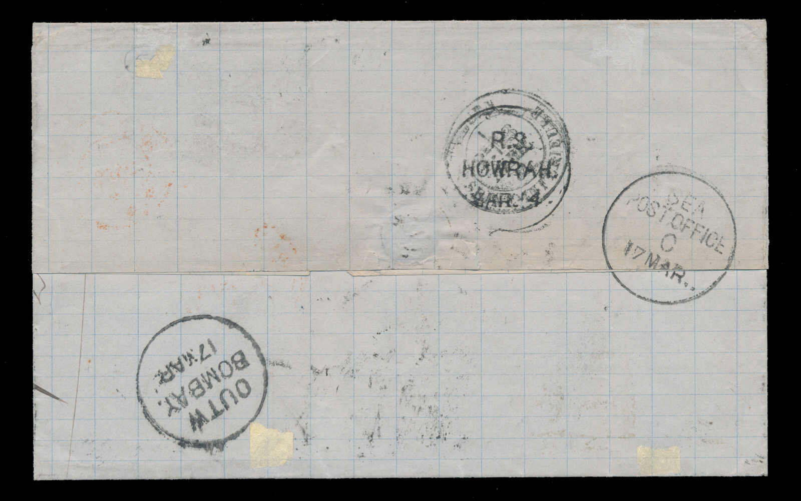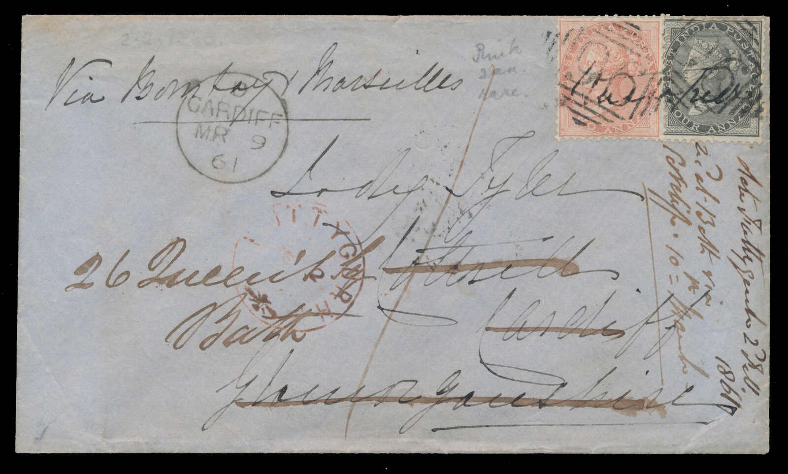 648 cover   image1861 (February 2), redirected cover to Lady Tyler in Wales, franked with 2a orange and 4a grey-black, tied by "96" grid cancel and in black manuscript, to Lady Tyler in Cardiff, endorsed "via Bombay & Marseilles", partial red "?TTYGURH" despatch, red "EX BOMBAY FE 8 1861" backstamp, CARDIFF receiver on front and back (Mar 9), redirected to Bath, with next-day c.d.s. arrival backstamp, some light edge toning, else fine. (Image 1) (Image 2)