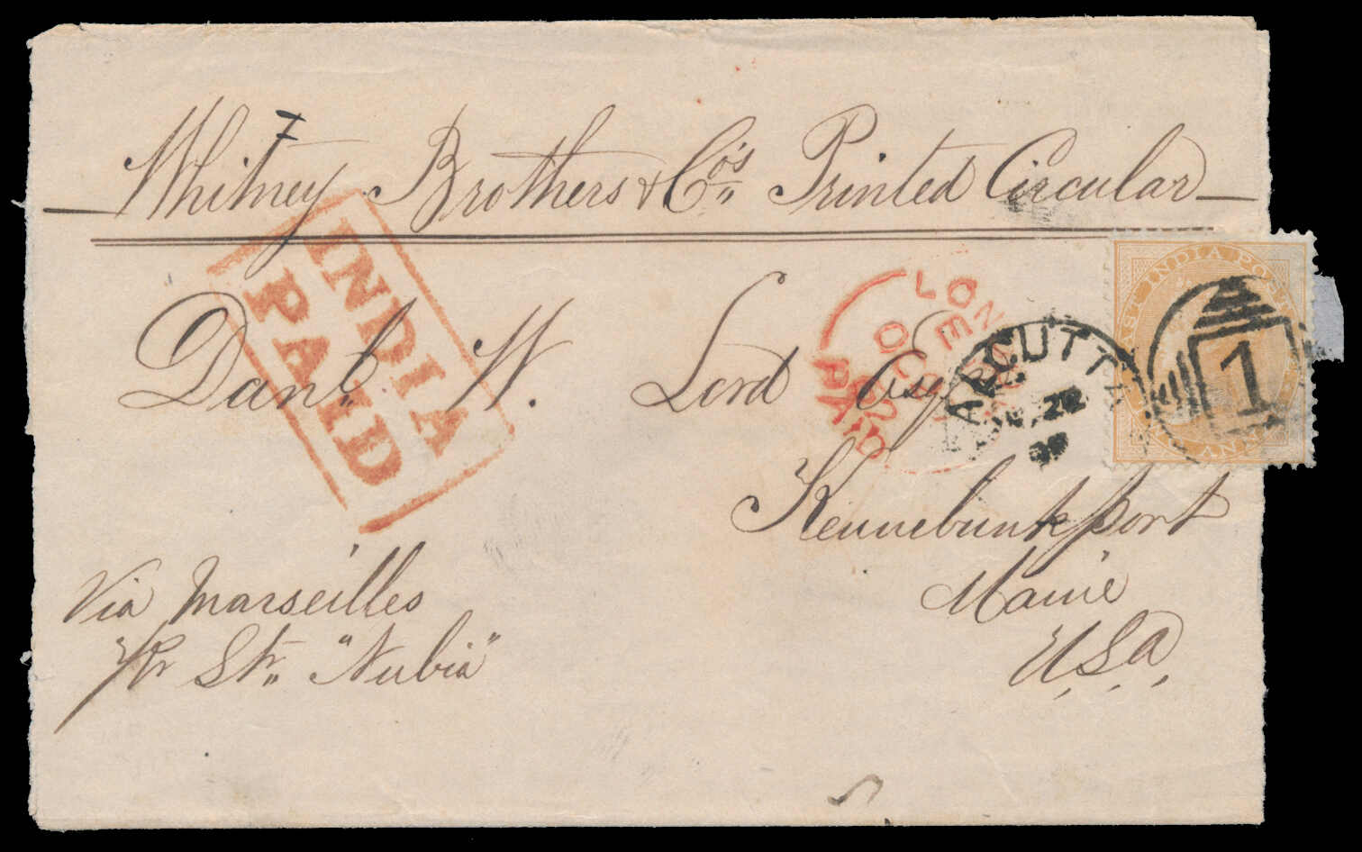 650 cover   image1862, 2a yellow orange, single franking on printed circular, adhesive tied to Whitney Brothers & Co printed circular by Calcutta "1" duplex, handstamped red "INDIA / PAID", endorsed "via Marseilles / pr Str "Nubia", to Kennebunkport, Maine, includes printed circular datelined Calcutta, 22nd September, 1862, being a "Semi-Monthly Market Report" with various import and export quotations, an uncommon example retaining contents, fine. (Image 1) (Image 2) (Image 3)