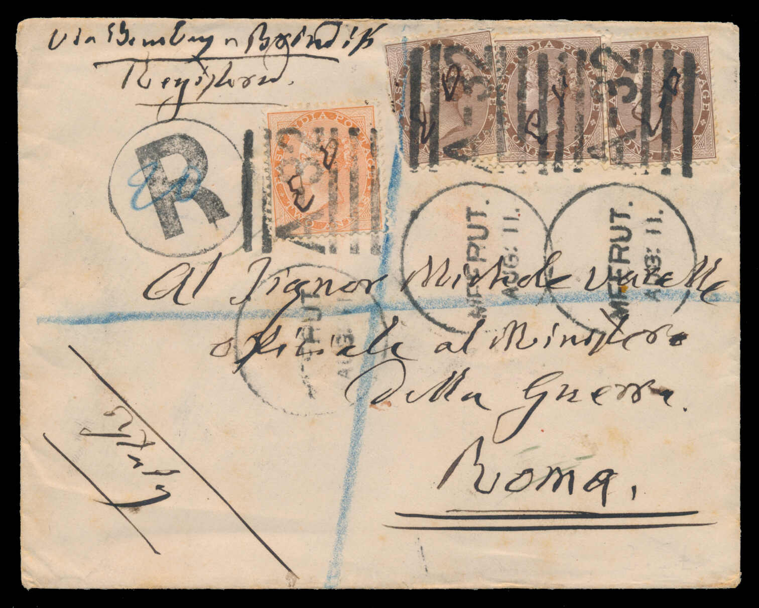 655 cover 59, 62 image1871 (August 11), registered cover from Meerut to Rome, Italy, franked with 2a orange and 1a deep brown (x3) each cancelled in manuscript and tied by "Meerut Aug 11 / A-32" duplex, endorsed "via Bombay & Brindisi", with boxed Meerut, Sea Post Office O (15 Aug) and Roma c.d.s. arrival backstamps, negligible edge toning, else quite fresh and very fine. (Image 1) (Image 2)