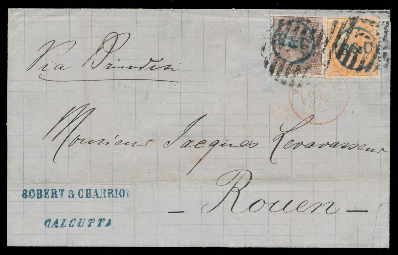659 cover   image1881, Calcutta to Rouen, France, via Brindisi, cover franked with 1a brown and 2a orange, cancelled by "R&C" security handstamp in green, tied to folded cover by circular grid cancel, Robert & Charriot, Calcutta merchant mark and French TPO transit c.d.s. (2 Apr) on front, addressed to Rouen, France, endorsed "via Brindisi," with Howrah (4 Mar), OUT Bombay (17 Mar), Sea Post Office (17 Mar), and Rouen (April) c.d.s. backstamps, filing folds clear of stamps, else fresh and very fine. (Image 1) (Image 2)