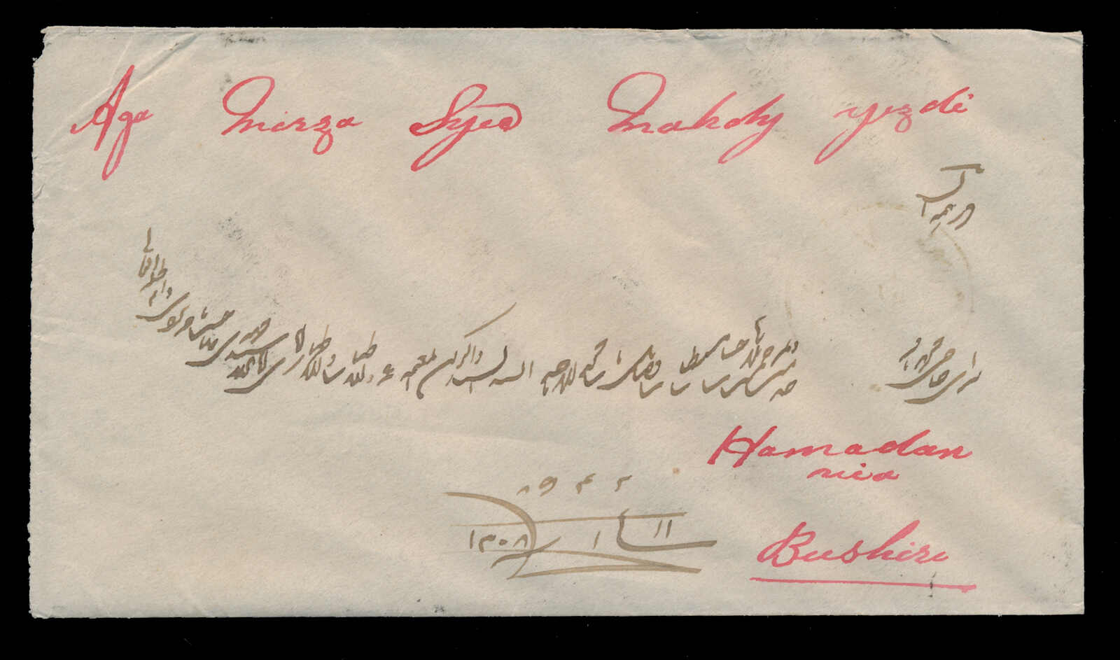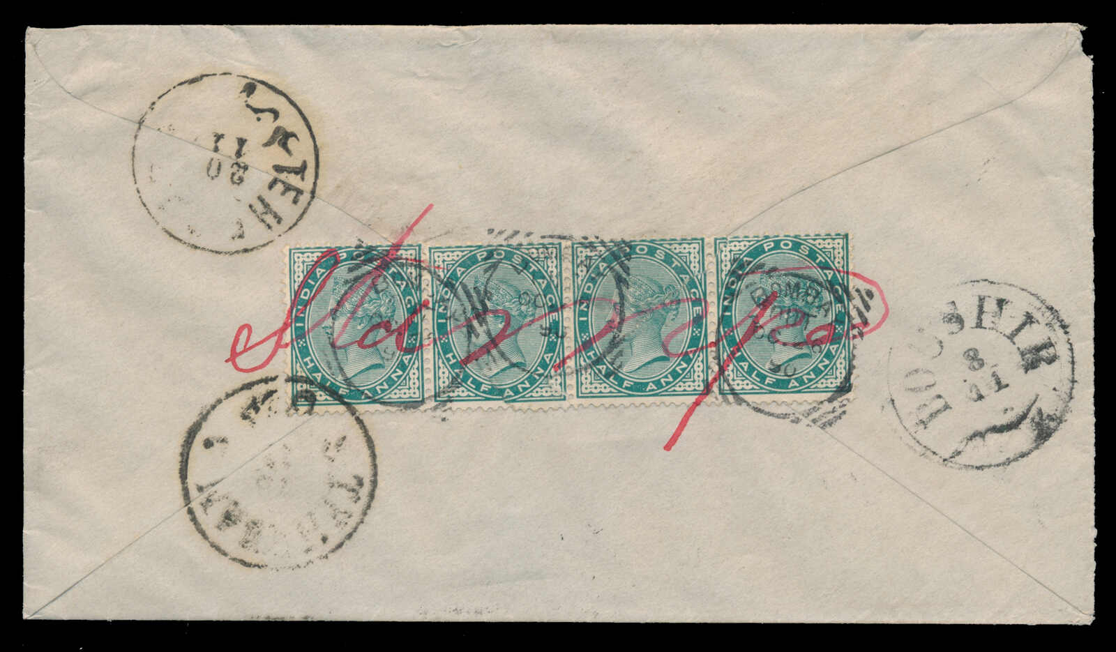 660 cover   image1890 (October 26), ½a deep blue green strip of four, on cover to Persia, strip tied to reverse by "BOMBAY / OUT / OC 26 /90" small squared circle and manuscript "Stamped" in red, "BOUSHIR / 8 / 11" transit c.d.s. and two "TEHRAN / 20 /11" arrival backstamps, small fault at upper left, else a sound cover to Persia. (Image 1) (Image 2)
