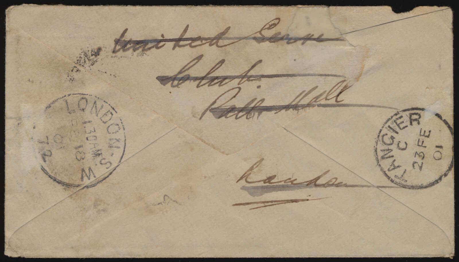 661 cover   image1901 (January 28), postal stationery cover to London, forwarded to Morocco, ½a stationery, uprated with ½a Queen Victoria definitive, tied by indistinct c.d.s., addressed to the United Service Club on Pall Mall, London, crossed-out and franked with 1½d Victoria, tied by London SW 45 duplex (18 Feb), for forwarding to the Hotel Ville de France in Tangiers, Morocco, reverse with London S.W. (18 Feb) transit and British Post Office in Tangier (23 Feb) arrival backstamp, flaw at upper left, else a most unusual forwarded cover to an elusive destination. (Image 1) (Image 2)