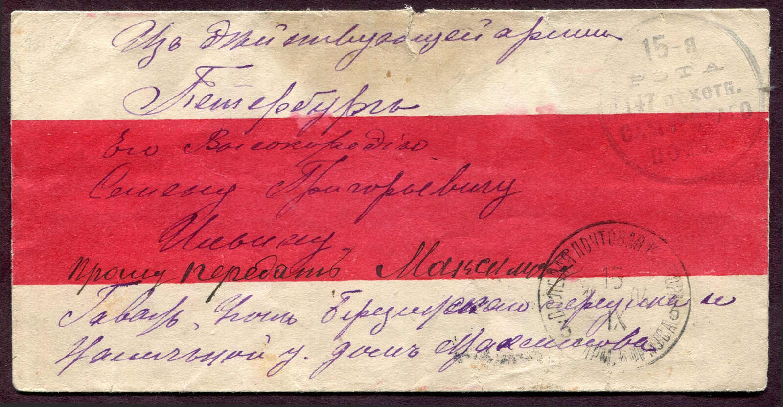 306 CVR   image1904, Russo-Japanese War fieldpost cover, 147th Samara Infantry Regiment, from Manchuria to St. Petersburg, red-band envelope struck with the scarce violet regimental cachet “15-я РОТА 147 ПЕХОТН. САМАРСКАГО…” (15th Company, 147th Samara Infantry Regiment), processed through the Polevaya Pochtovaya Kontora of the 1st Army Corps, with a clear St. Petersburg arrival (1904) on reverse, a desirable Russo-Japanese War usage from Manchuria, scarce in this quality. (Image 1) (Image 2)