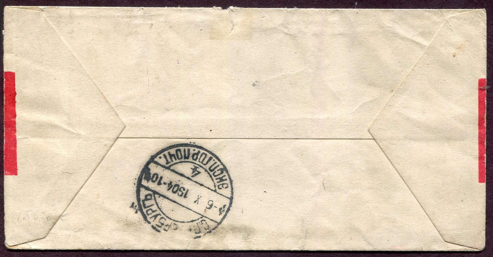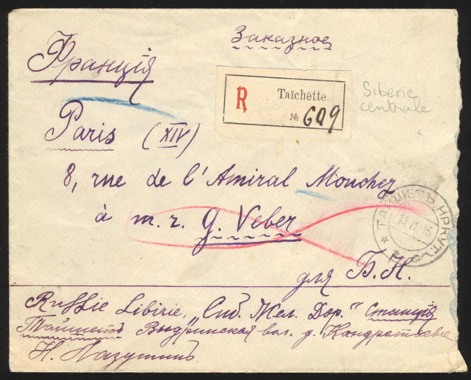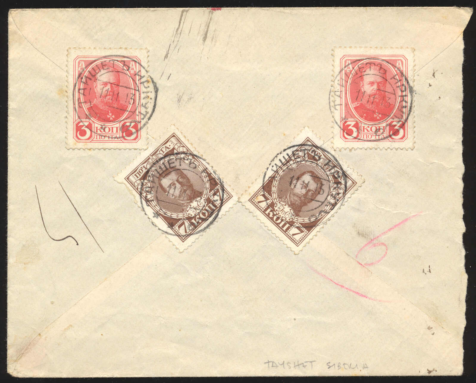 311 CVR   image1913 (November 14), registered cover from Tayshet, Siberia to Paris, franked on reverse with two 3k red and two 7k brown & carmine Nicholas II issues paying the foreign registered rate, all tied by fine ТАИШЕТЪ (14 11 13) datestamps, the front showing red R / Taïchette registration label, addressed to 8 Rue de l’Amiral Mouchez, Paris, slightly roughly opened at right, else a clean and attractive pre-war registered letter from a small Trans-Siberian railway town. (Image 1) (Image 2)