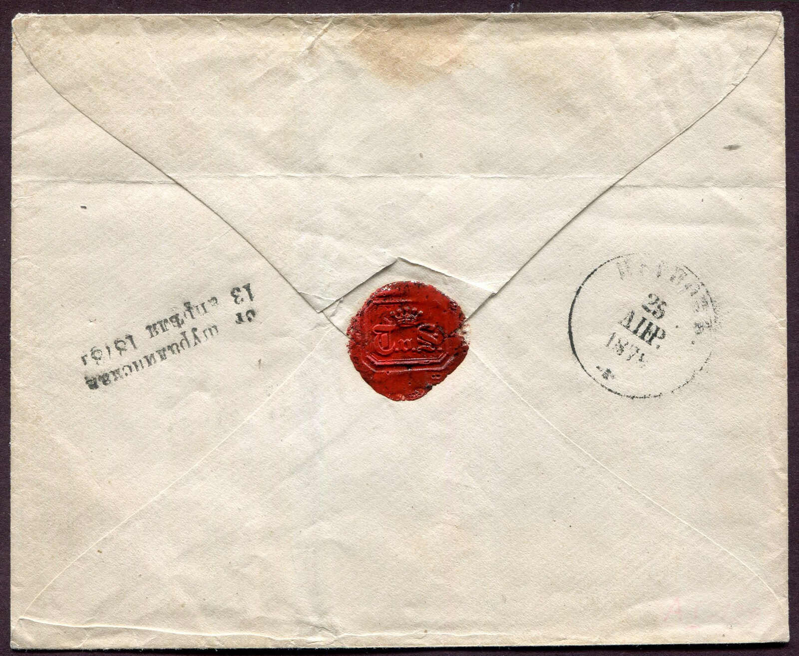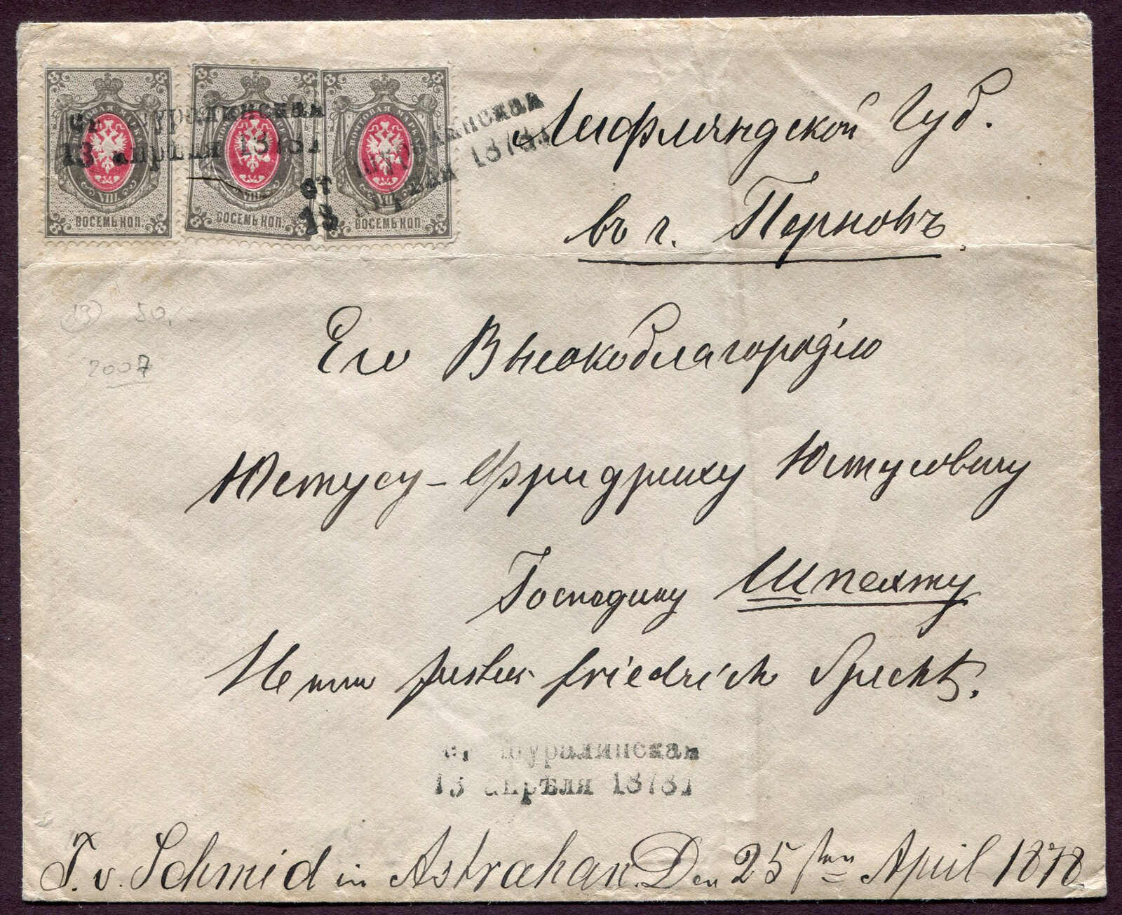 305 CVR   image1878 (April 13), 8k Arms issue triple franking on cover from Shuralinskaya (Astrakhan Governorate) to Pernov, Estonia, three single 8k grey & rose Coat of Arms issues tied by boxed two-line Cyrillic handstamp “ИЗЪ ШУРАЛИНСКА / 13 АПРѢЛЯ 1878”, sender’s endorsement in German at lower left “T. v. Schmid in Astrahan den 25ten April 1878,” reverse with ПЕРНОВЪ (25 Apr) arrival and intact red wax seal with crowned initials, small imperfections, an attractive rural commercial usage to the Baltic provinces. (Image 1) (Image 2)