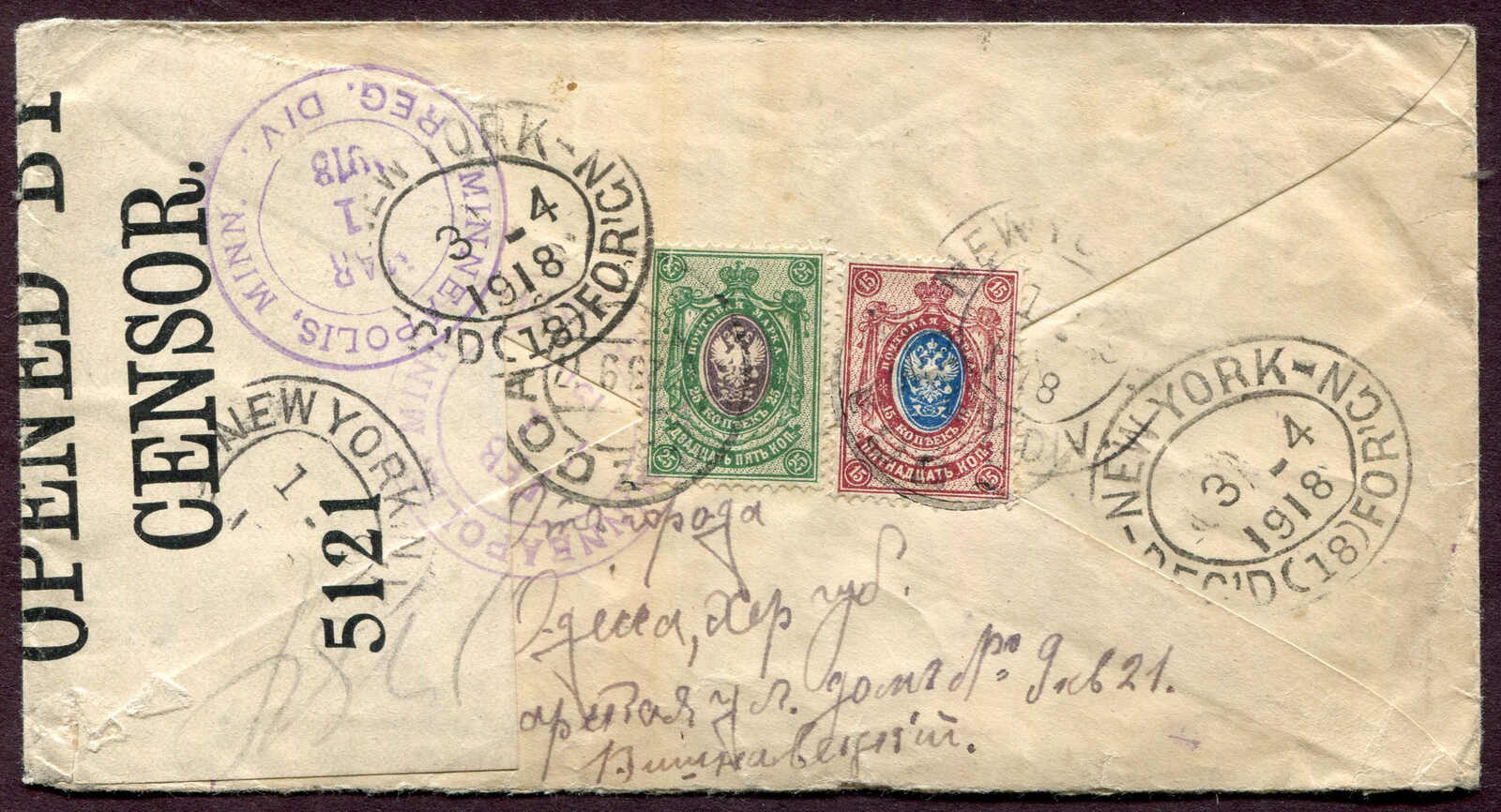 316 CVR   image1918 (September 23), 15k and 25k Imperial Arms issues on censored registered cover from Odessa to Minneapolis, returned unclaimed, stamps tied on reverse by Odessa double-circle datestamps, front with red-and-black Odessa registration label, violet straight-line REGISTERED, violet boxed Д. Ц. (Дозволено Цензурой – passed by censor), British-style OPENED BY CENSOR tape at left, struck with bold violet pointing-hand RETURNED TO WRITER / UNCLAIMED handstamp, backstamps including New York Foreign Reg’y Div. (29 Jan), Minneapolis Reg. Div. (1 Feb and 1 Mar), and New York oval (3–4 Apr) on return, with Cyrillic manuscript return notation on reverse, a desirable WWI and Russian Revolution–period registered cover censored in both countries, twice attempted for delivery, and returned overseas. (Image 1) (Image 2)