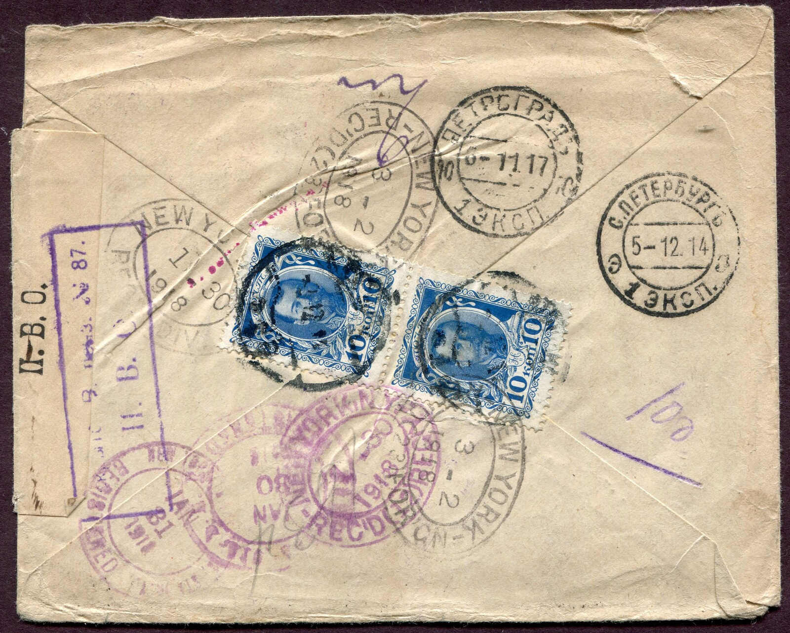 312 CVR   image1914–18 (December 2), 10k pair on censored registered cover from Warsaw to New York, held for three years and returned unclaimed, reverse franked with pair of 10k deep blue Nicholas II issues tied by two ВАРШАВА 1 / 2.12.14 c.d.s., front with matching violet ВАРШАВА 1 / 2.12.14 c.d.s. and R Varsovie 1 registration label, affixed with Russian military censor tape inscribed Военная цензура at left and struck front and back with boxed violet military censor handstamps, large black pointing-hand RETURNED TO WRITER / UNCLAIMED marking across front, multiple transit markings including St Petersburg (5 Dec 1914), Petrograd (6 Nov 1917) showing delayed release, New York Foreign Reg’y Div. (30 Jan 1918), New York RECEIVED (30–31 Jan), and New York (2 Mar 1918) on return, reverse with Cyrillic manuscript instruction to return to sender, minor edge and flap wear, a dramatic WWI and Russian Revolution–period registered cover retained in Russia for more than three years before its eventual return, very fine considering its arduous journey. (Image 1) (Image 2)