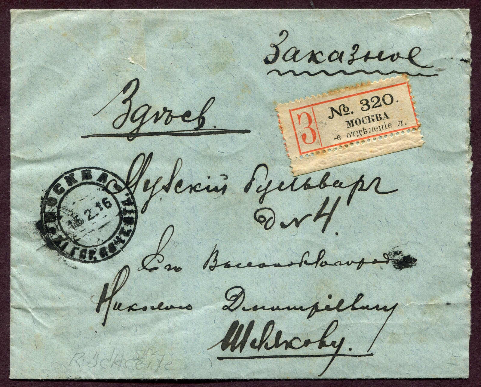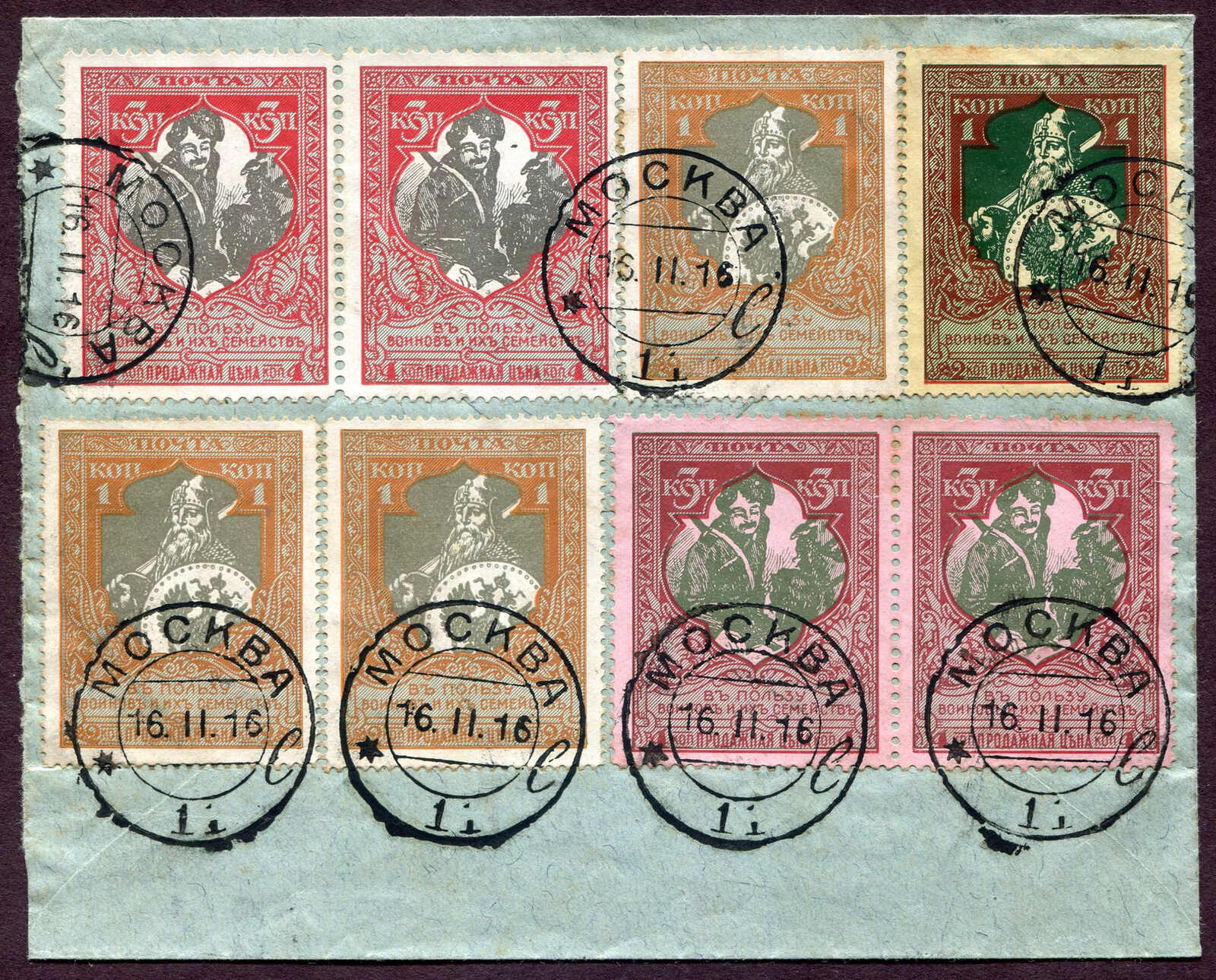 313 CVR   image1916 (16 February), registered local cover within Moscow, franked on reverse with a spectacular multiple franking of the semi-postal Legendary Russian Hero issue, comprising three 1k orange-brown & gray, one 1k red-brown & dark green on straw paper, a pair of 3k carmine & dark brown on white paper, and a pair of 3k maroon & dark green on pink paper, all tied by clear strikes of the MOCKBA 16.II.16 double-circle datestamp, front with matching MOCKBA 16.2.16 c.d.s. and red-and-black MOCKBA registration label, a highly attractive and scarce local registered usage. (Image 1) (Image 2)