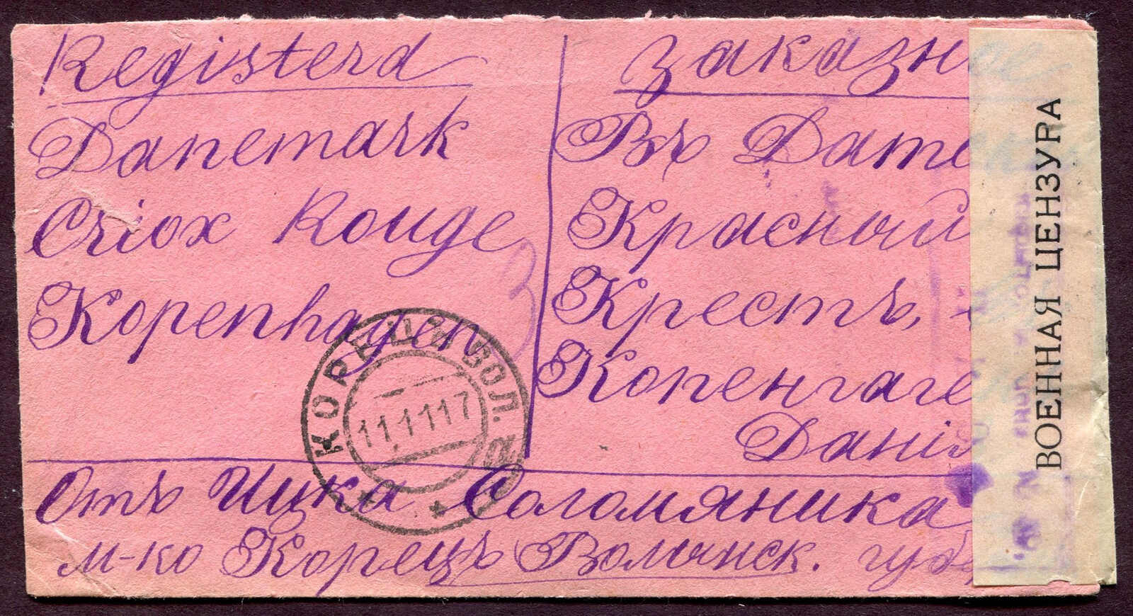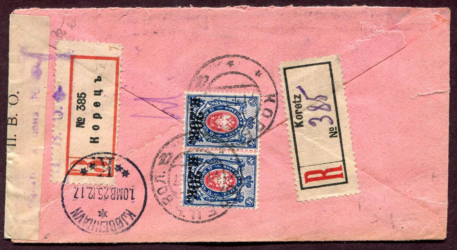 314 CVR   image1917 (11 November), WWI censored registered cover from Koretz (Volhynia) to the Red Cross, Copenhagen, franked on reverse with a pair of 20k on 14k Romanov Coat of Arms surcharges, stamps and cover tied by three strikes of the double-circle KORETZ VOL. datestamp, front with matching strike and violet boxed censor handstamps applied across Russian censor tape at left, reverse showing clear KØBENHAVN 25.12.17 arrival, dual registration etiquettes, fresh and very fine. (Image 1) (Image 2)