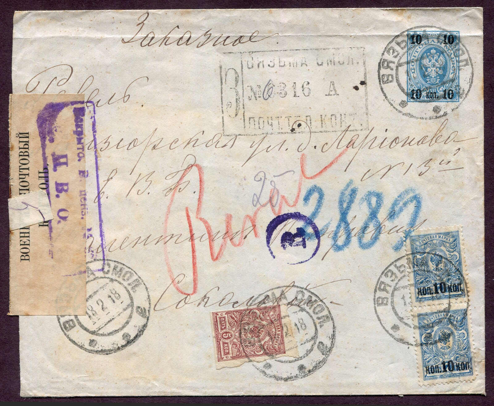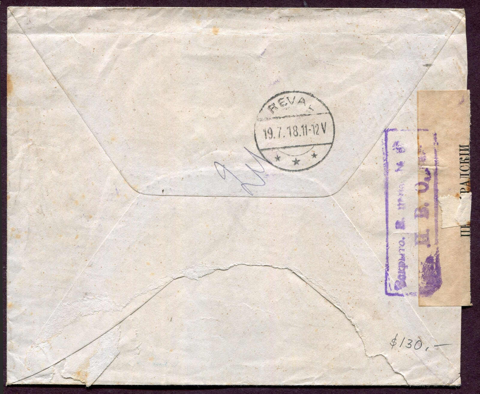 315 CVR   image1918 (February 18), registered WWI censored postal stationery cover from Vyazma (Smolensk) to Reval, Estonia, uprated with an imperforate 5k and a perforated pair of 10k Imperial Eagle overprints, all tied by strikes of the black double-circle VYAZMA SMOL. datestamp of 18.2.18, with boxed VYAZMA SMOL. POST & TELEGRAPH CONTROLregistration cachet at top, Russian military censor tape at left struck on both sides with violet boxed censor handstamps, reverse showing a clear REVAL (19.7.18) arrival, a scarce registered censorship usage from the final months of Imperial postal administration as Estonia passed into German occupation prior to independence, light handling wear only, else very fine. (Image 1) (Image 2)