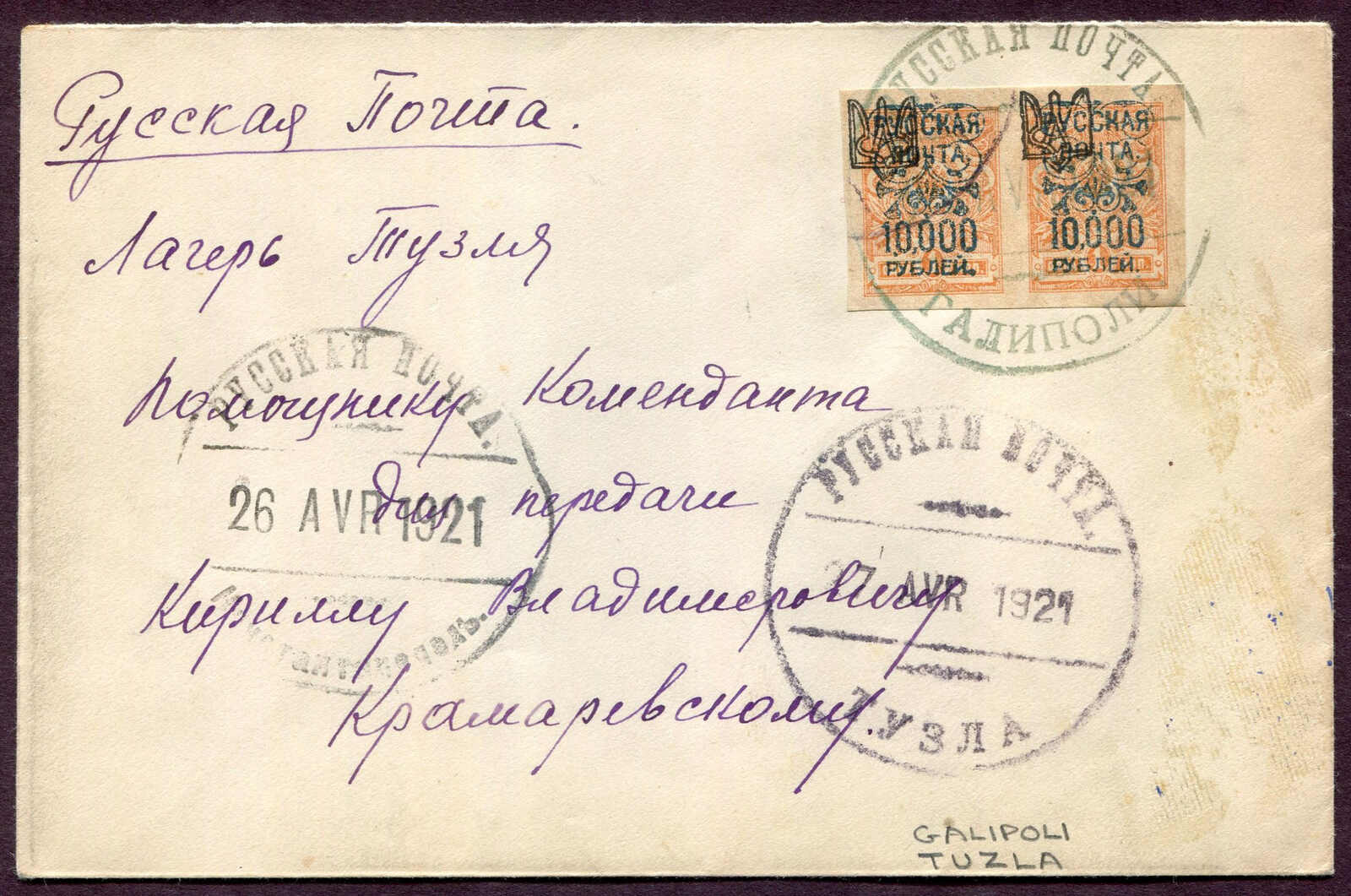 318 CVR   image1921 (25 April), Wrangel Army refugee post from Gallipoli to Tuzla, franked with trident-overprinted 10 000r Arms pair, tied by large green Russkaia Pochta Gallipoli (25 Apr) datestamp, with further green strikes reading Russkaia Pochta / Nash Lager’ Gallipoli (26 Apr) and Russkaia Pochta Tuzla receiver of the same date, addressed to the Camp Commandant at Tuzla with directive for delivery to Kirill Vladimirovich Kramarevsky, a presentable and entirely genuine refugee correspondence showing three distinct Wrangel camp post offices, fine-very fine and desirable. (Image 1)
