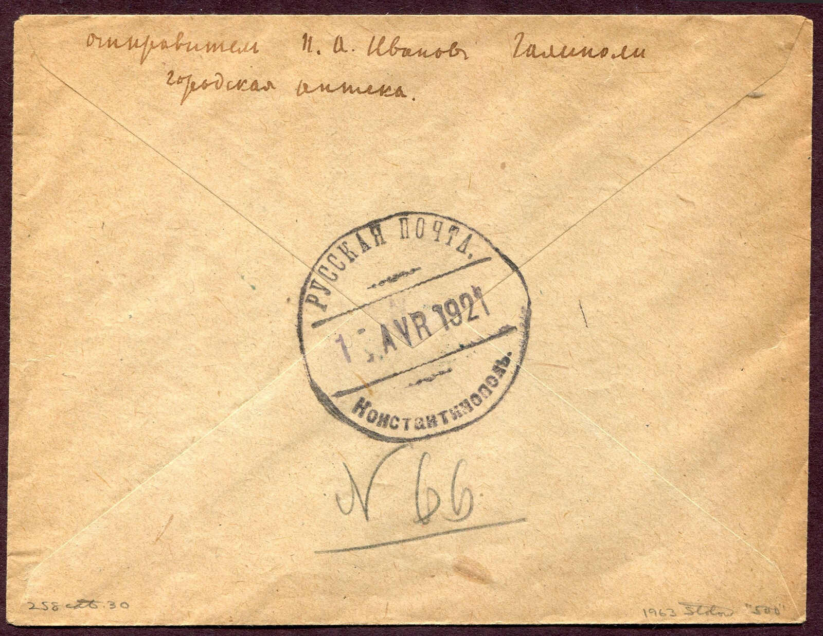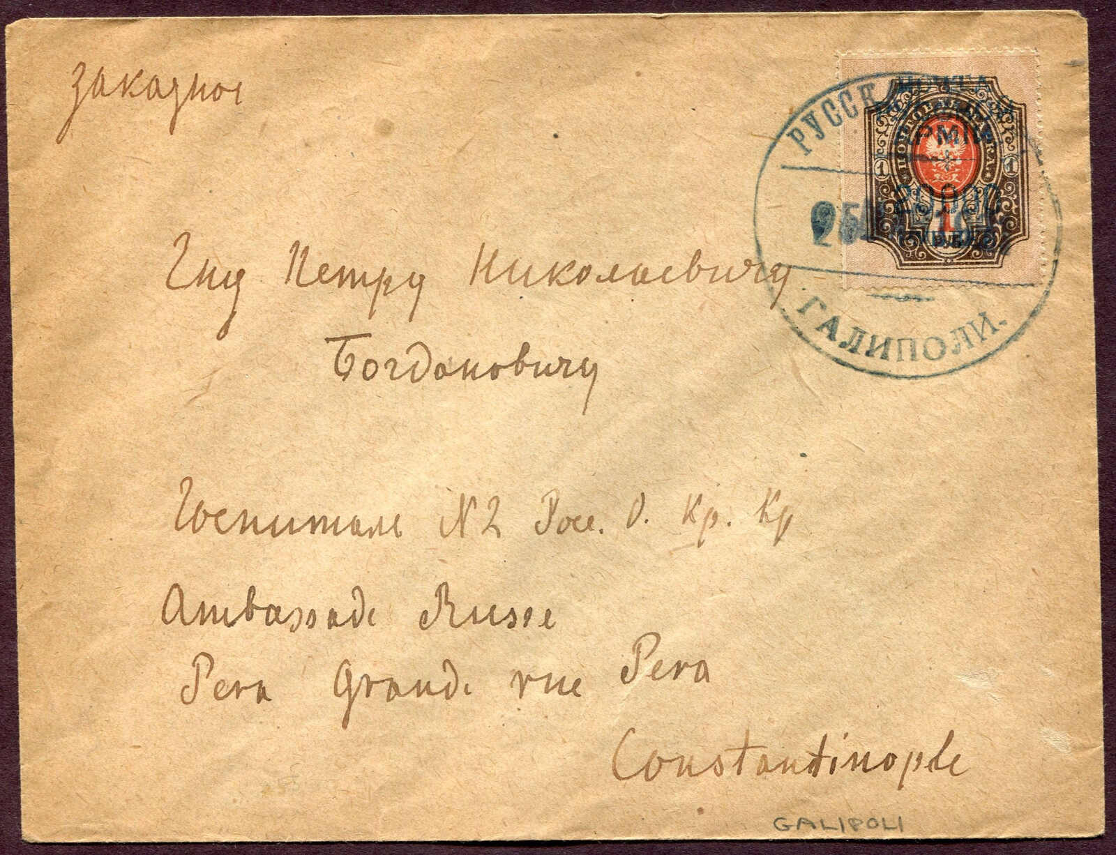 317 CVR   image1921 (25 March), Wrangel Army refugee post from Gallipoli to Constantinople, cover franked with the Wrangel Army 20 000r surcharge on 1r Imperial Arms issue, tied by a large circular Russkaia Pochta / Galipoli datestamp (25 Mar), reverse showing clear Russkaia Pochta / Konstantinopol’ arrival (1 Apr), a very fine camp-to-city usage from the White émigré postal system maintained under General Wrangel for the exiled Russian forces in Turkey. (Image 1) (Image 2)