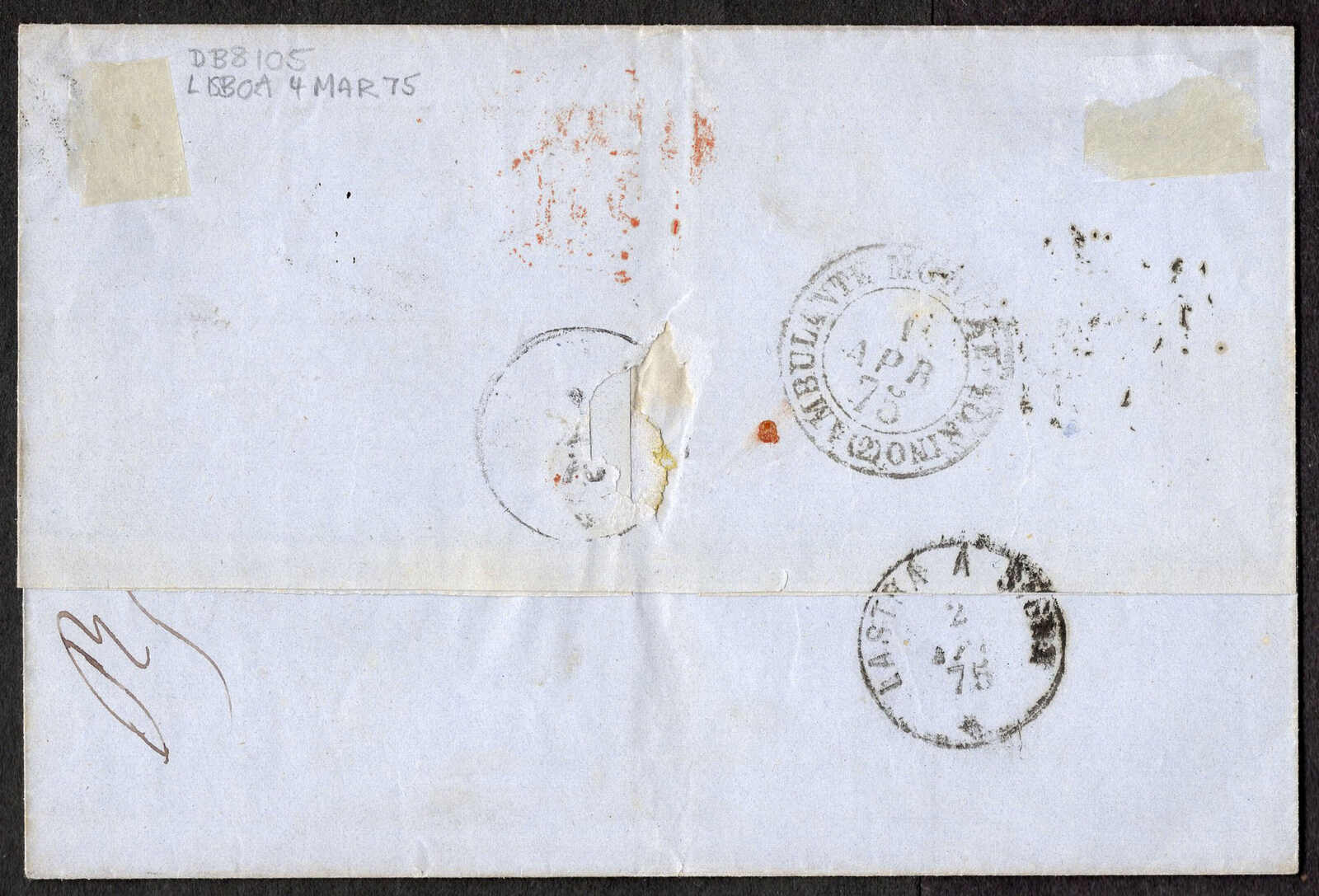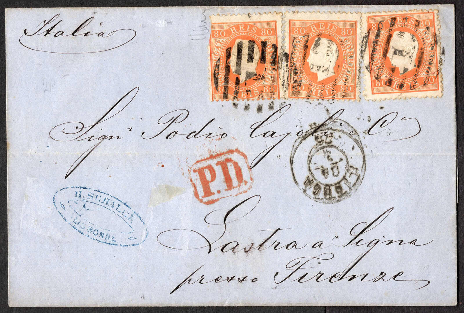 302 CVR   image1875 (March 4), 240 réis folded letter Lisbon to Lastra a Signa, Italy, franked with three 80 réis orange King Luiz I, the stamps showing fresh colour and sound perforations and tied by barred oval "1" cancels with a clear Lisboa (4 Mar) circular datestamp alongside, struck with boxed red P.D. indicating full prepayment, addressed to Lastra a Signa presso Firenze and showing on reverse AMBULANTE MODENA–TORINO (1 Apr) transit and LASTRA A SIGNA (2 Apr) arrival datestamps, the 240 réis franking paying the pre-UPU single-rate letter (up to 7½ g) to Italy via France, minor fold and small hinge traces on back, fine and appealing. (Image 1) (Image 2)