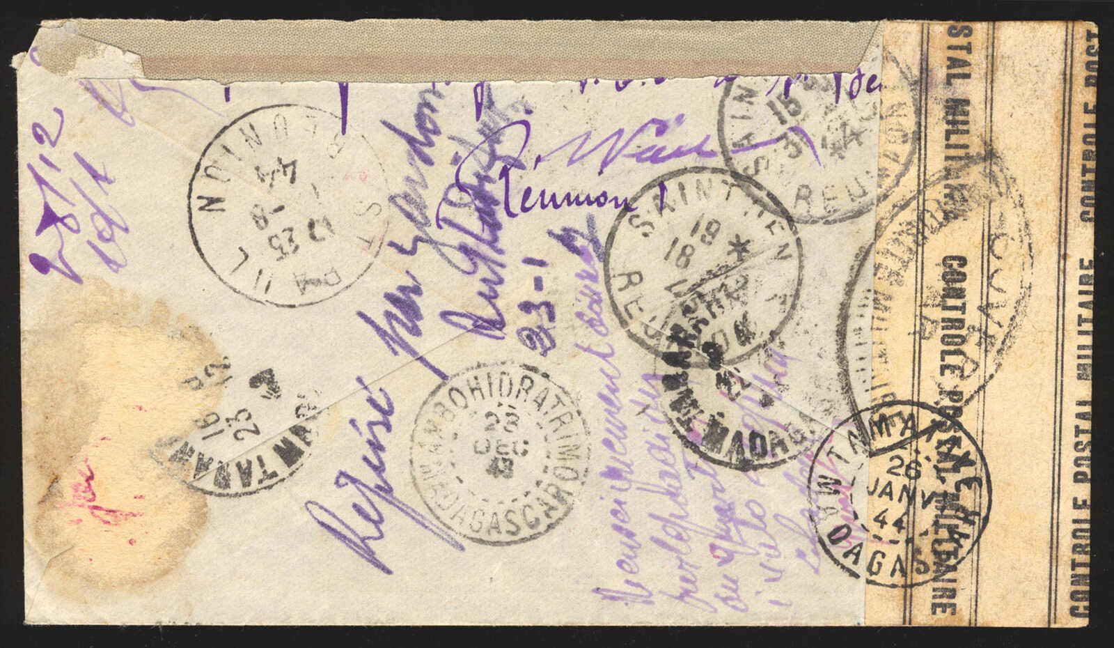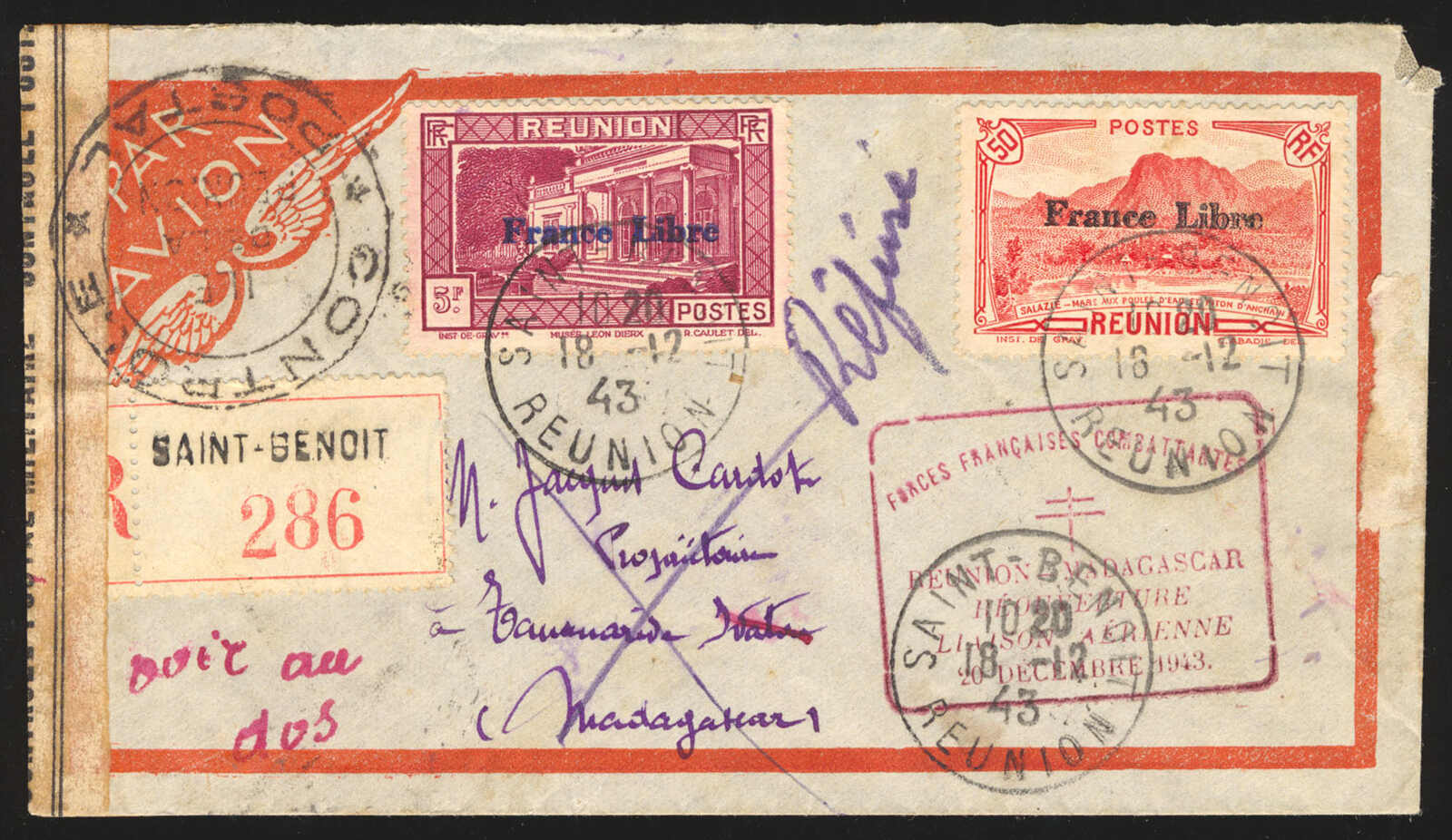 303 CVR   image1943 (18 December), Réunion “France Libre” first-flight registered airmail, Saint-Benoît to Madagascar, franked with 5f and 50c “France Libre” overprints tied by three strikes of SAINT-BENOÎT / RÉUNION 18-12-43 c.d.s., censored and registered from Saint-Benoît to Tananarive, showing the large boxed first-flight cachet FORCES FRANÇAISES COMBATTANTES / RÉUNION – MADAGASCAR / RÉOUVERTURE LIAISON AÉRIENNE / 20 DÉCEMBRE 1943, sealed and re-sealed with Contrôle Postal Militaire censor tape and handstamps, backstamped Ambohidratrimo (23 Dec) and Tananarive (23 Dec), refused on delivery with bold violet Refusé and returned via Tamatave (26 Jan), St-Paul transit and final Saint-Benoît (31 Jan) arrival, small flap tip excised, else a scarce and desirable Free French first-flight usage. (Image 1) (Image 2)