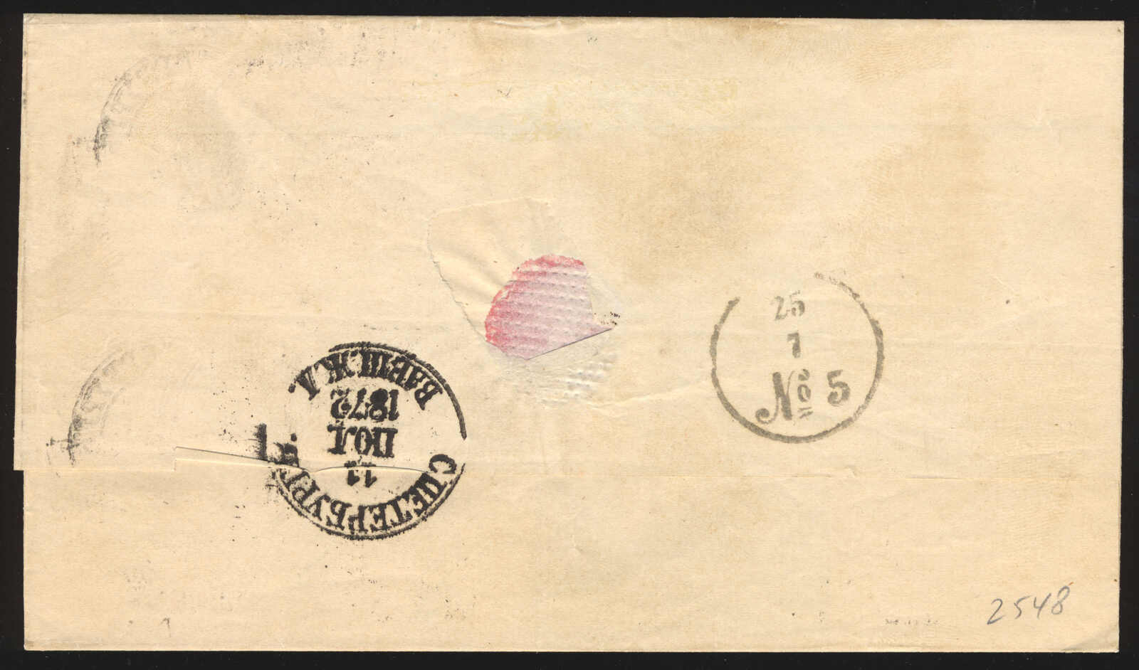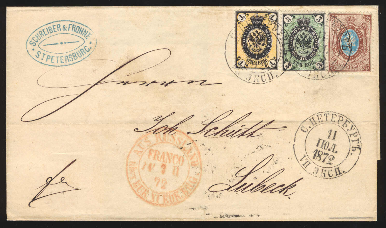 304 CVR   image1872 (July 11), Russia folded letter St Petersburg to Lübeck, franked with 1k black and yellow, 3k black and green, and 10k brown and blue Arms issue, the stamps fresh and tied by fine strikes of С.-ПЕТЕРБУРГЪ VI ЭКСП. 11 ИЮЛ. (St. Petersburg) circular datestamps, showing on front the clear red "AUS RUSSLAND / FRANCO / Eydtkuhnen" exchange marking with Lübeck backstamp (25 Jul), a clean and attractive three-colour franking. (Image 1) (Image 2)