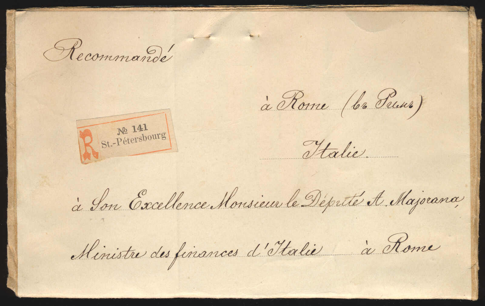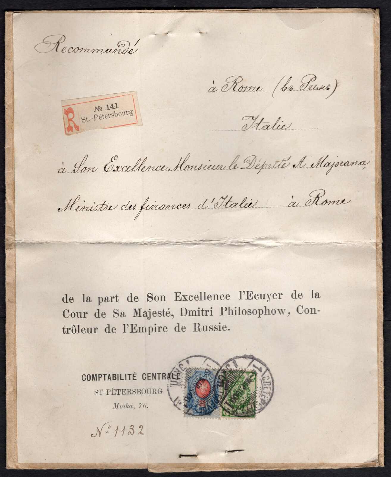 310 CVR   image1906 (March 6), Russia registered official cover St Petersburg to Rome, oversized, franked 22k with 20k carmine and blue and 2k green and black Arms issue, both stamps fresh and tied by С.-ПЕТЕРБУРГЪ 6 МАР. 1906 circular datestamps, bearing St-Pétersbourg No. 141 registration label and endorsed Recommandé, a large Comptabilité Centrale envelope posted on behalf of His Excellency Dmitri Philosophov, Controller of the Empire of Russia, addressed in French to His Excellency A. Majorana, Minister of Finance of Italy, Rome, scarce ministerial correspondence from Imperial Russia to Italy. (Image 1) (Image 2)