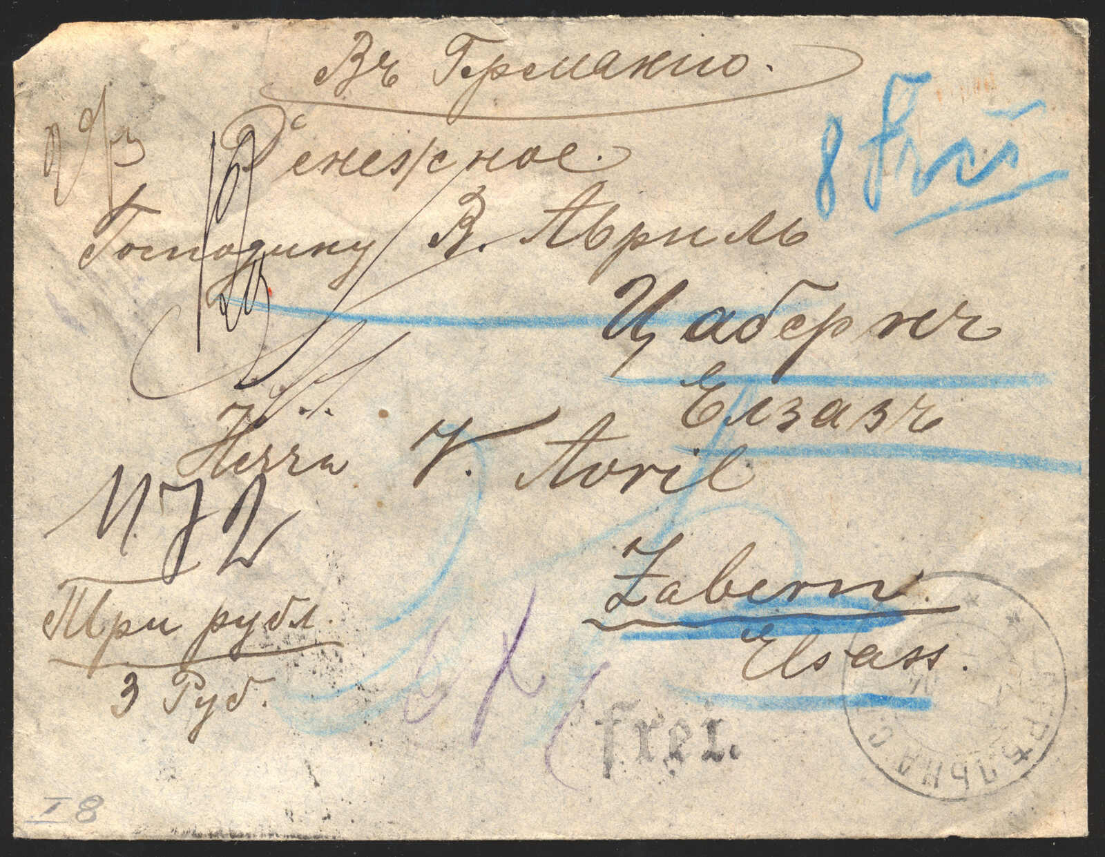 308 CVR   image1904 (June 12), Russia official “Frei” cover Strelna to Zabern (Alsace), large official envelope endorsed Въ Германiюand, bearing violet FREI handstamp with extensive manuscript accounting notations including “3 руб.” and “8 Frs”, tied by clear СТРЕЛЬНА С. ПЕТЕРБУРГ. 12 VI 1904 datestamp at lower right, sealed on reverse by five large red wax Imperial seals, showing crisp transits Кыбарты / Ж.Д.П.О. (13 Jun) and Zabern (15 Jun), addressed to V. Moritz in Zabern, Alsace (then within the German Empire), a fine Russo–German “Frei” usage. (Image 1) (Image 2)