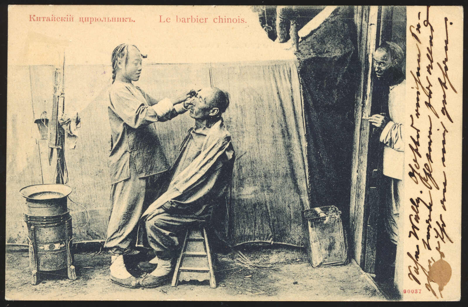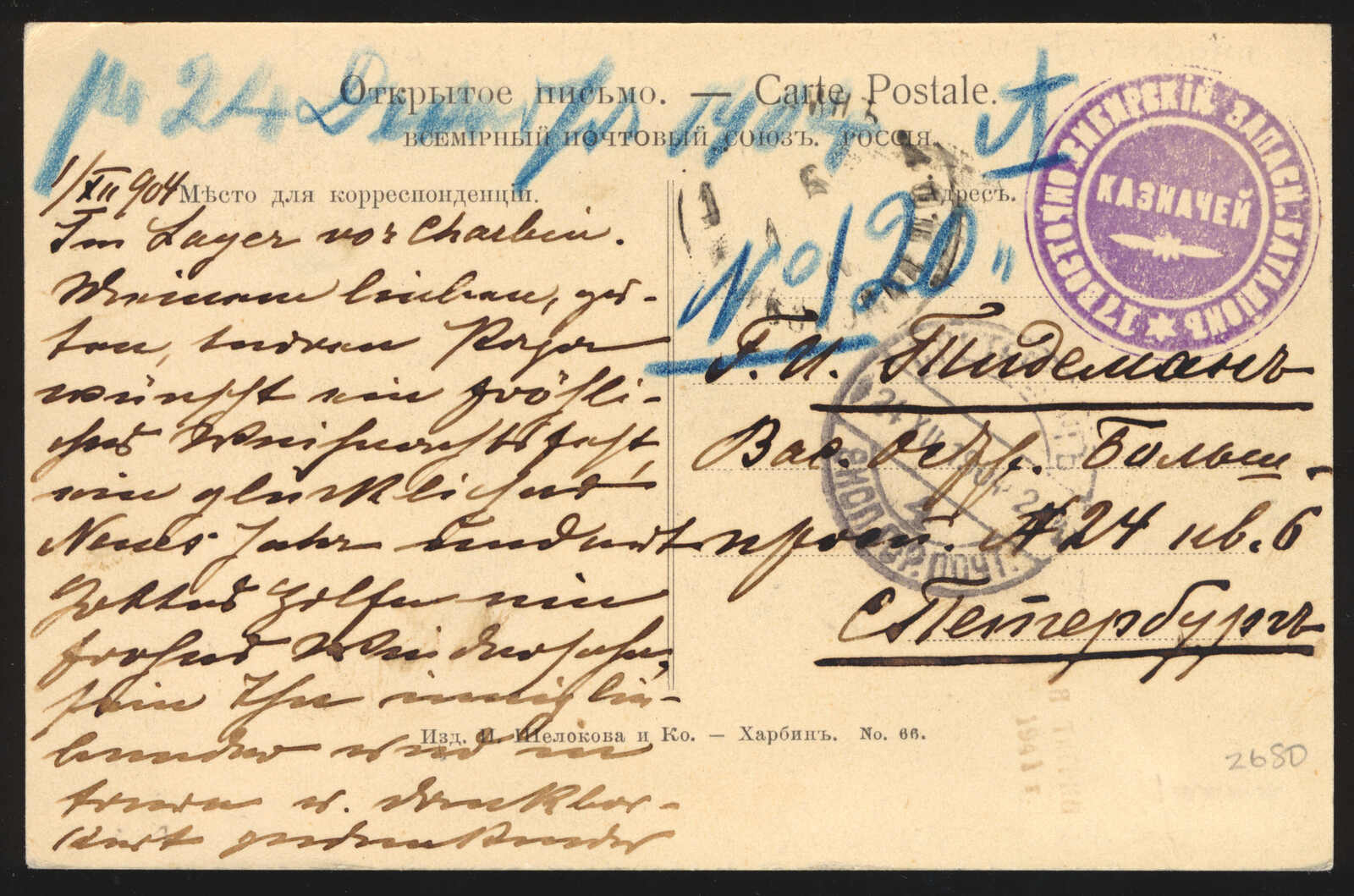 309 CVR   image1904 (December 6), Russo-Japanese War, postcard from Harbin, Manchuria to St. Petersburg, “Chinese barber” postcard by S. Shelokov & Co. postmarked by Harbin Railway Post Office datestamp (6 Dec), struck with a clear violet intaglio cachet “Казначей / 17-й Восточно-Сибирский Запасной Батальонъ” of the Paymaster, 17th East Siberian Reserve Battalion, with St. Petersburg (24 Dec) arrival datestamp, the message datelined Harbin Camp with New Year greetings, a fine TPO card with military paymaster's cachet, very fine. (Image 1) (Image 2)