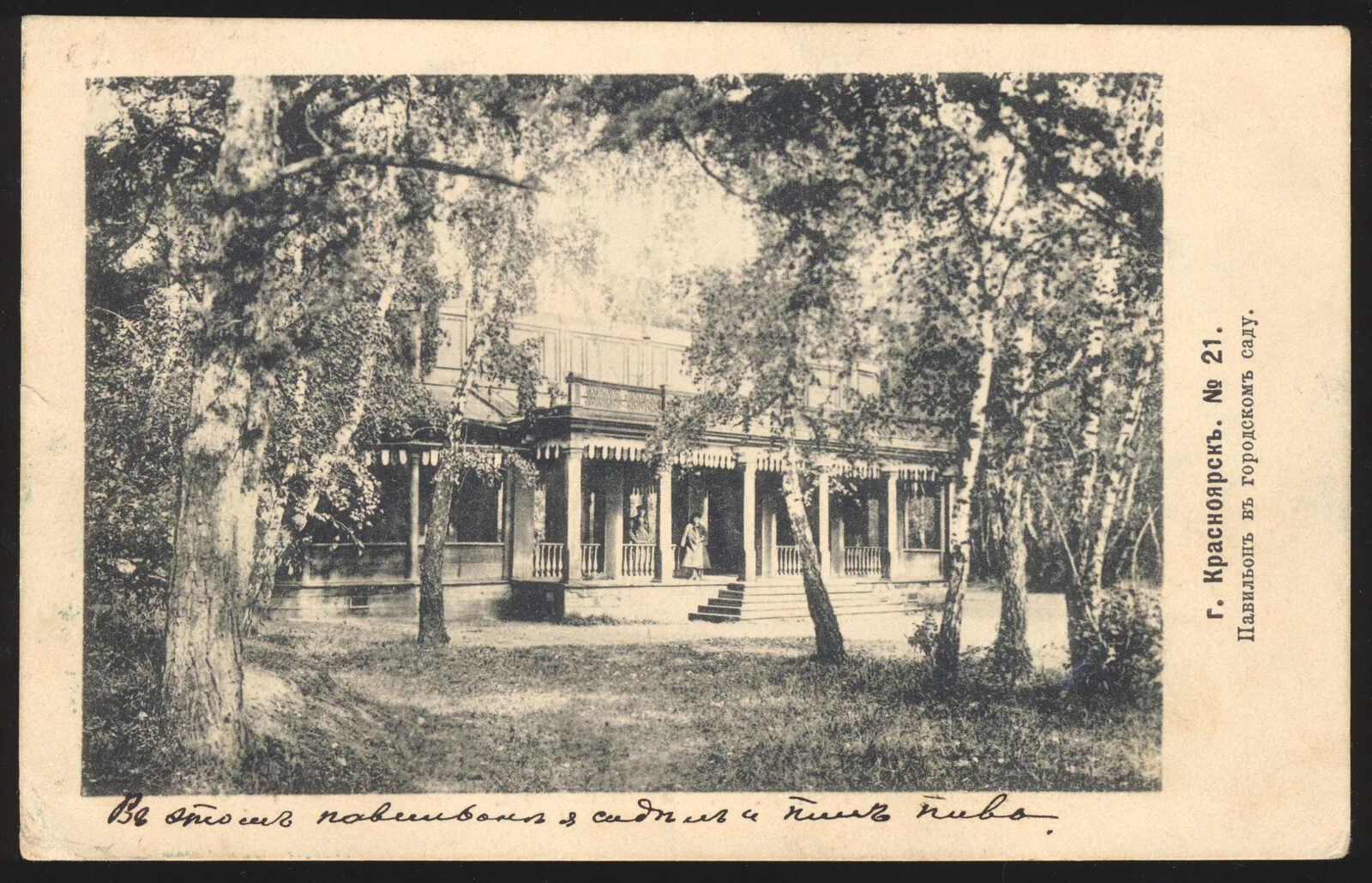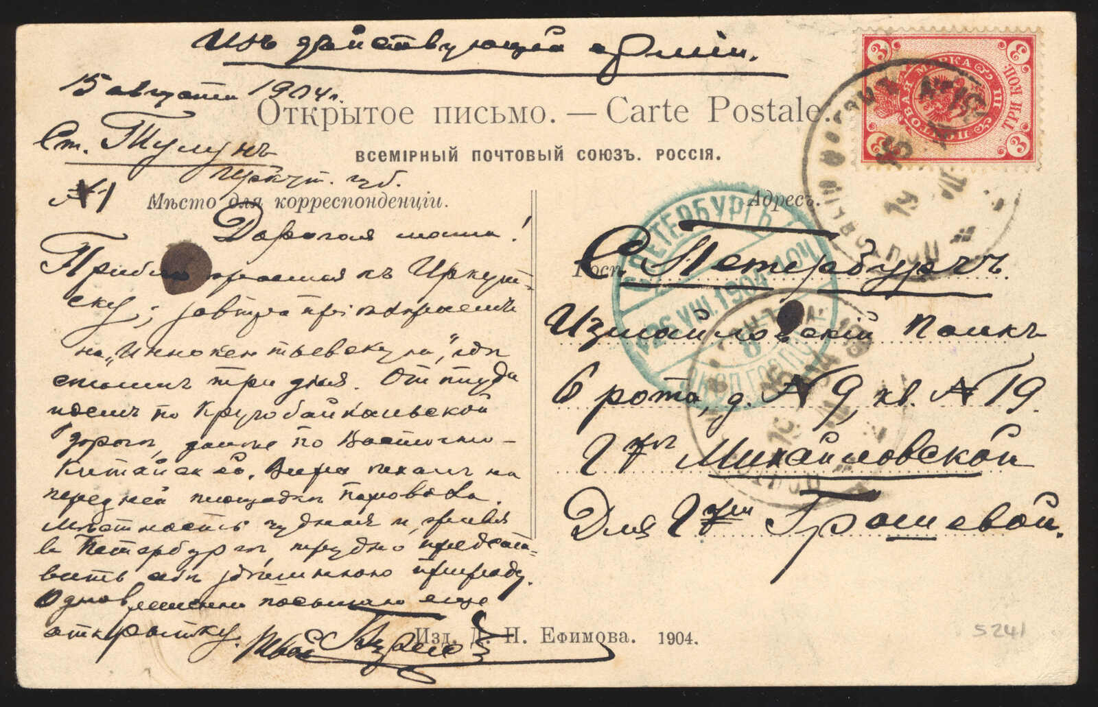 307 CVR   image1904 (July 15), Russo-Japanese War, postcard from Tulun Station, Siberia to St. Petersburg, “Krasnoyarsk – Pavilion in the City Garden” (N. Efimov, 1904) postcard franked 3k red Arms issue, tied by "Krasnoyarsk–Irkutsk Postal Wagon No. 198" c.d.s., manuscript “Iz deistvuiushchei armii” (“On active service”) at top, St. Petersburg green arrival c.d.s. (26 Aug), the message describing onward travel via the steamer Innokentevskaya, the railway around Lake Baikal and the Chinese Eastern Railway, and remarking on the dramatic Siberian landscape compared with life in St. Petersburg, a fine Russo-Japanese War period usag, fine-very fine. (Image 1) (Image 2)