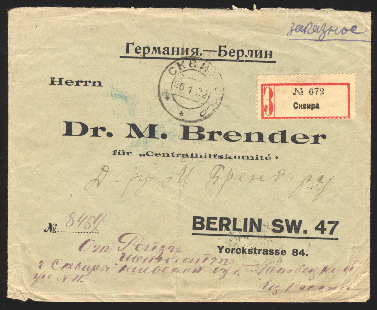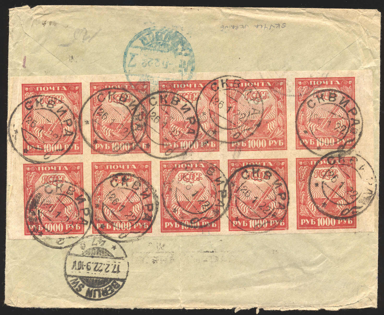 319 CVR   image1922 (January 26), registered inflation cover from Skvyra, Kiev Guberniya to Berlin, envelope bearing on the reverse a block of ten 1000r carmine Arms, neatly tied by fine Сквира (Skvyra, 26 Jan) circular datestamps, with matching red “Сквира № 672” registration label, Berlin SW (17 Feb) arrival on reverse, typical edge wear as expected, yet overall clean and well-preserved, a scarce small-town Ukrainian registered usage and attractive franking. (Image 1) (Image 2)