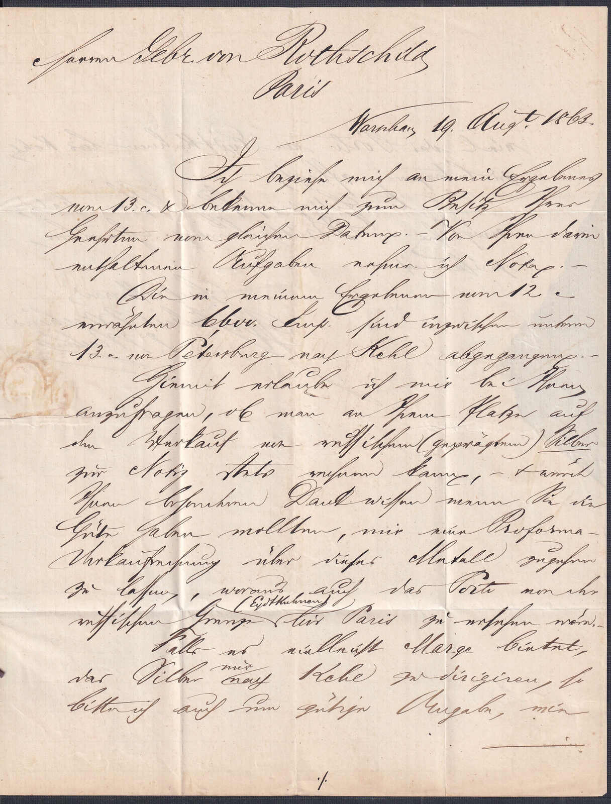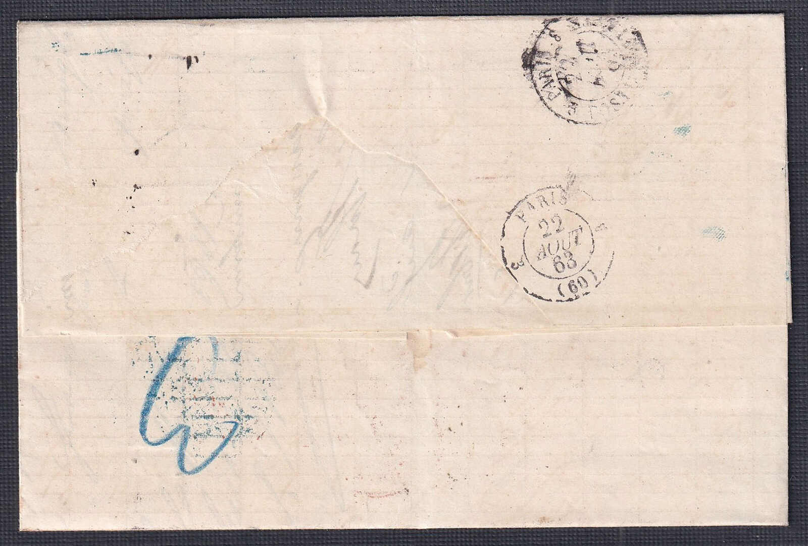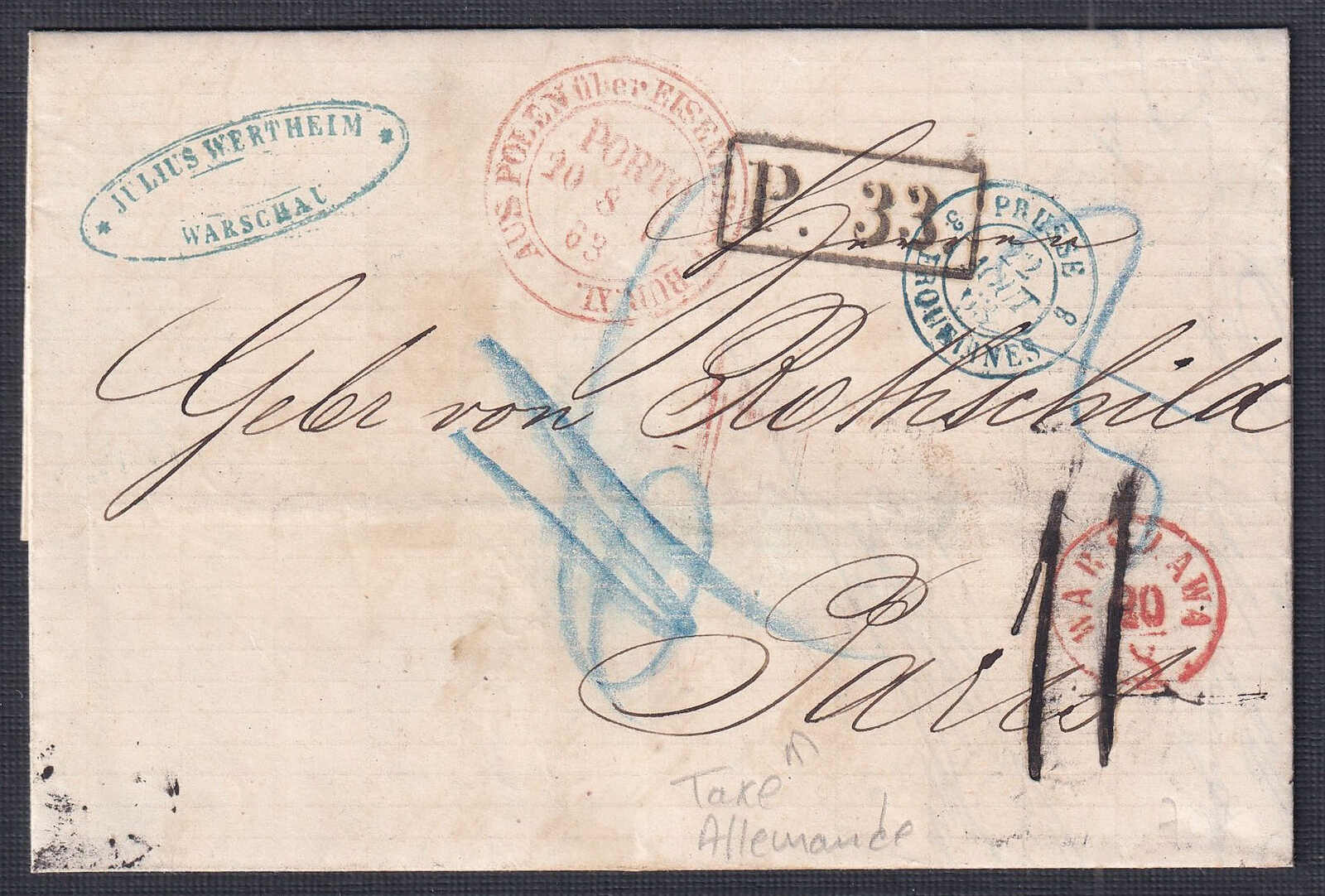 301 CVR   image1863 (August 19), Warsaw to Paris, France, “AUS POLEN ÜBER EISENB. POST BUREAU XI” exchange marking, folded letter, with contents datelined Warsaw, struck with a fine red AUS POLEN ÜBER EISENB. POST BUREAU XI / 20–8–63 double-line handstamp applied at the Prussian–Russian frontier, below this boxed P.33 Prussian accounting mark and blue crayon “8” décimes due in manuscript, further struck with circular PRUSSE ERQUELINNES / 3 / 22 AOUT 63 double-circle French entry datestamp, small red Warsaw despatch, the reverse showing neat PARIS (R. du Faubourg St. Denis) and PARIS (Distribution) receivers (22 Aug), the letter clean with minor file folds, very fine. (Image 1) (Image 2) (Image 3) (Image 4)