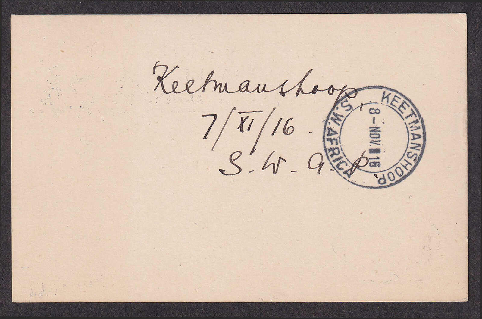 337 CVR   image1916 (November 8), Headquarters, 1st Military Constabulary, Active Service postcard, struck with choice Keetmanshoop SW Africa c.d.s., sent locally, with equally crisp HEADQUARTERS / 1st MILITARY CONSTABULARY regimental marking, a lovely card, scarce and very fine. (Image 1) (Image 2)