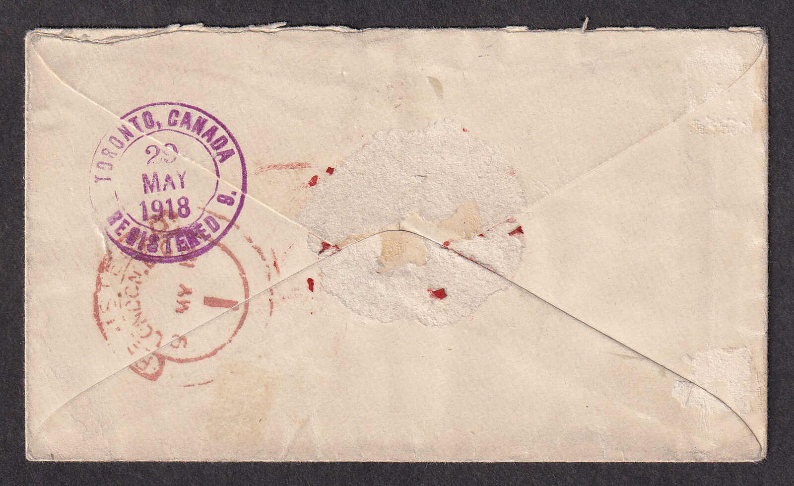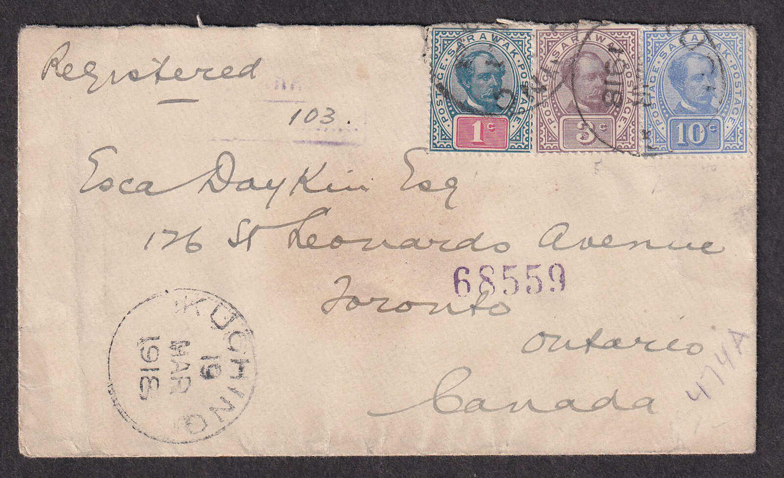 336 CVR 36, 38, 41 image1918 (March 19), registered cover from Kuching to Ottawa, Canada, franked with 1c, 3c & 10c Sir Charles J. Brooke definitives, tied by Kuching single-circle cancellations, further free strike at lower left, manuscript 'registered' with faint violet REGISTRATION handstamp at upper left, red hooded London (1 May) and violet Toronto (23 May) transit backstamps, wax seal has been removed, some light overall aging, but an otherwise fine cover to an uncommon destination. (Image 1) (Image 2)