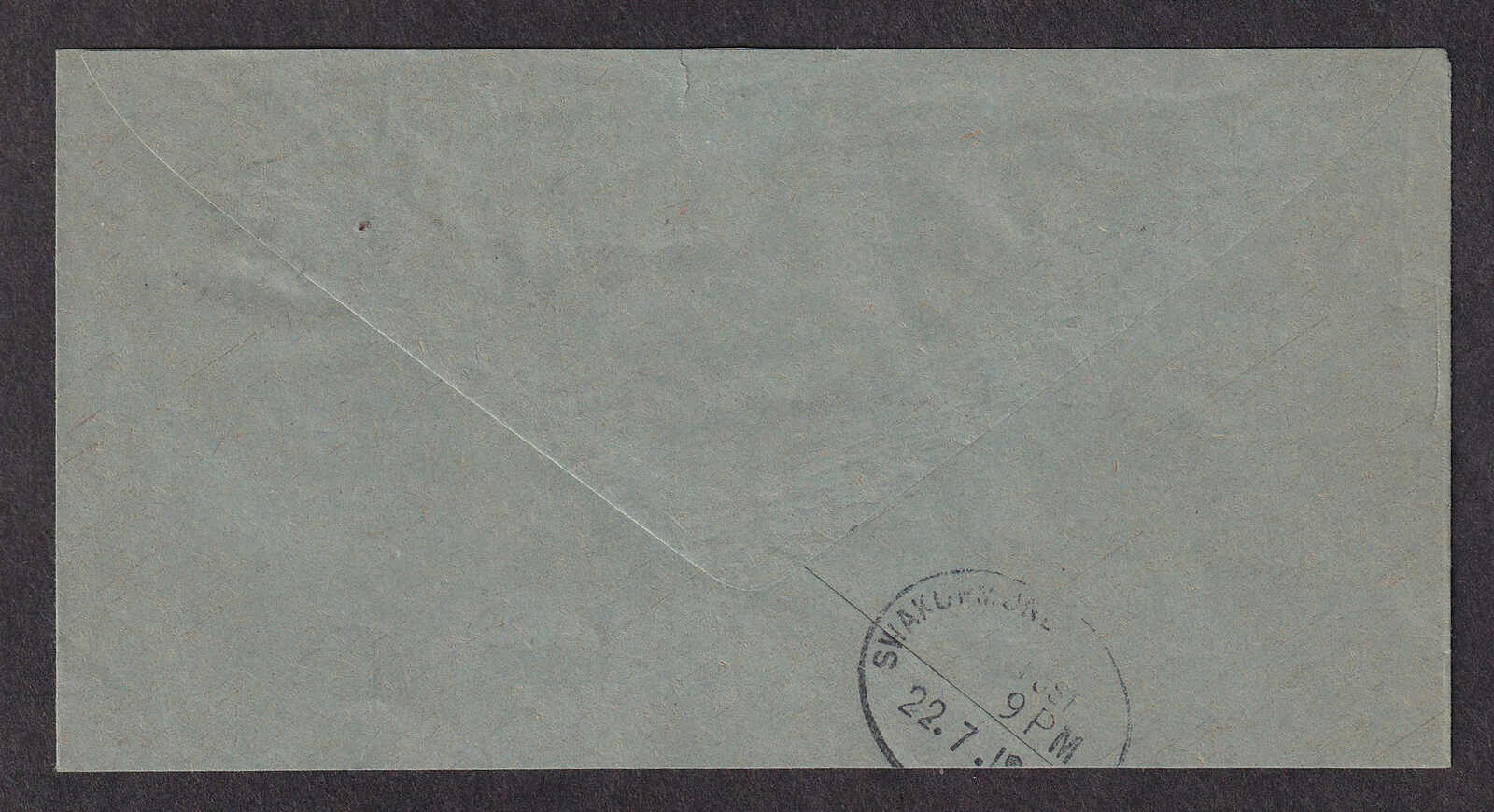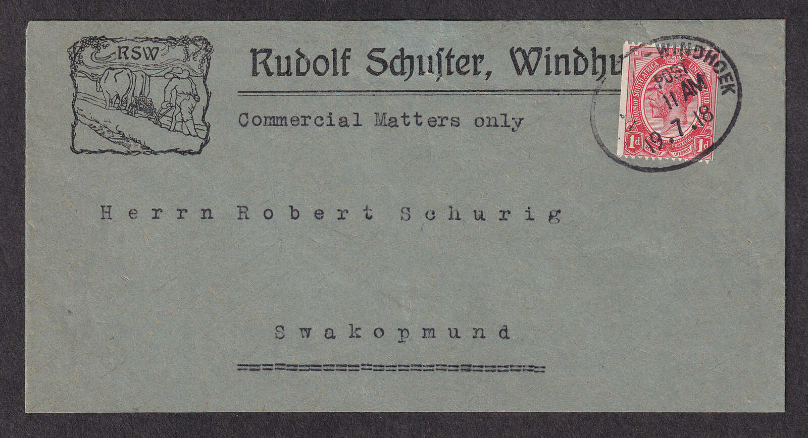 338 CVR   image1918 (July 19), 1d coil franking of South Africa on advertising cover from Windhoek, tied by mutilated bahnpost cancel of German South West Africa, to Swakopmund, with further choice strike of mutilated Swakopmund bahnpost hammer, attractive illustrated advertisement for the firm of Rudolf Schuster, a lovely and fresh example of this coil stamp franking, very fine. (Image 1) (Image 2)