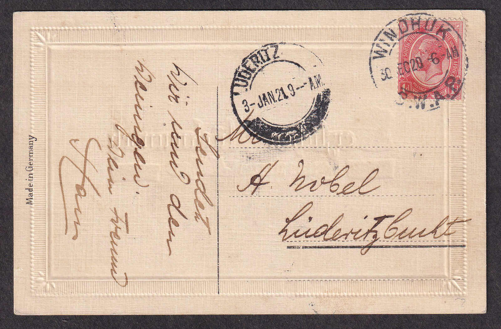 340 CVR   image1920 (December 30), mutilated Luderitzbucht cancellation, postcard franked with South Africa 1d King George V, tied by Windhuk / S.W.A.P. c.d.s., to Luderitzbucht, with clear c.d.s. receiver of "Luderitz" (3 Jan), the "bucht" having been removed, a well-struck example of this difficult marking. (Image 1) (Image 2)