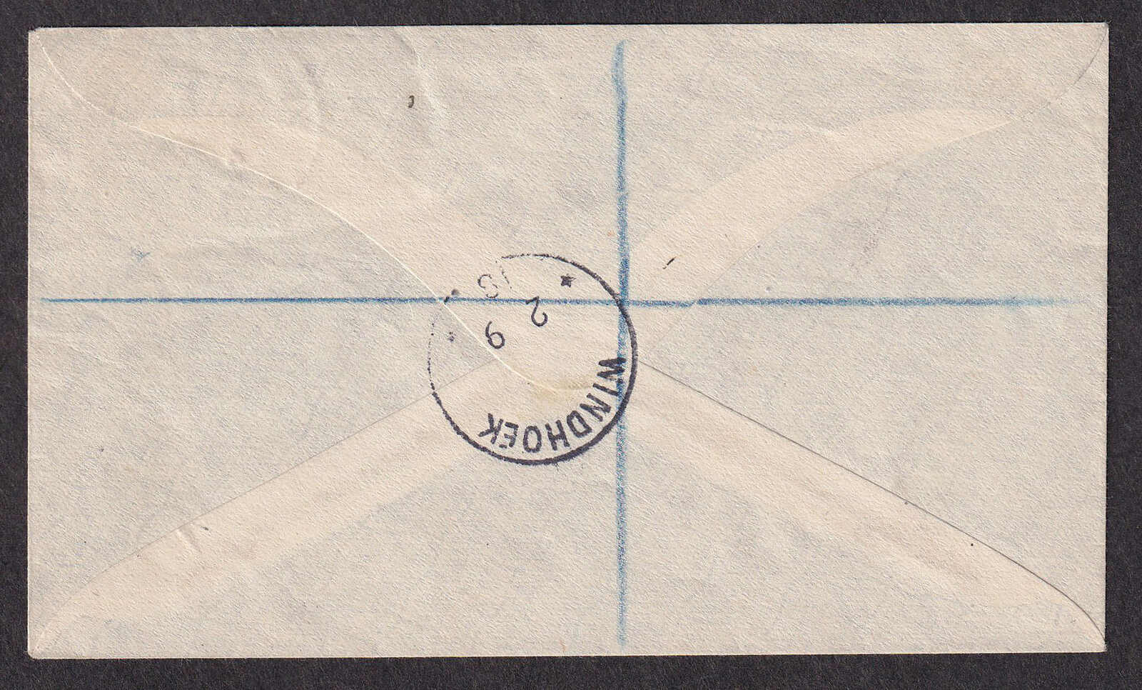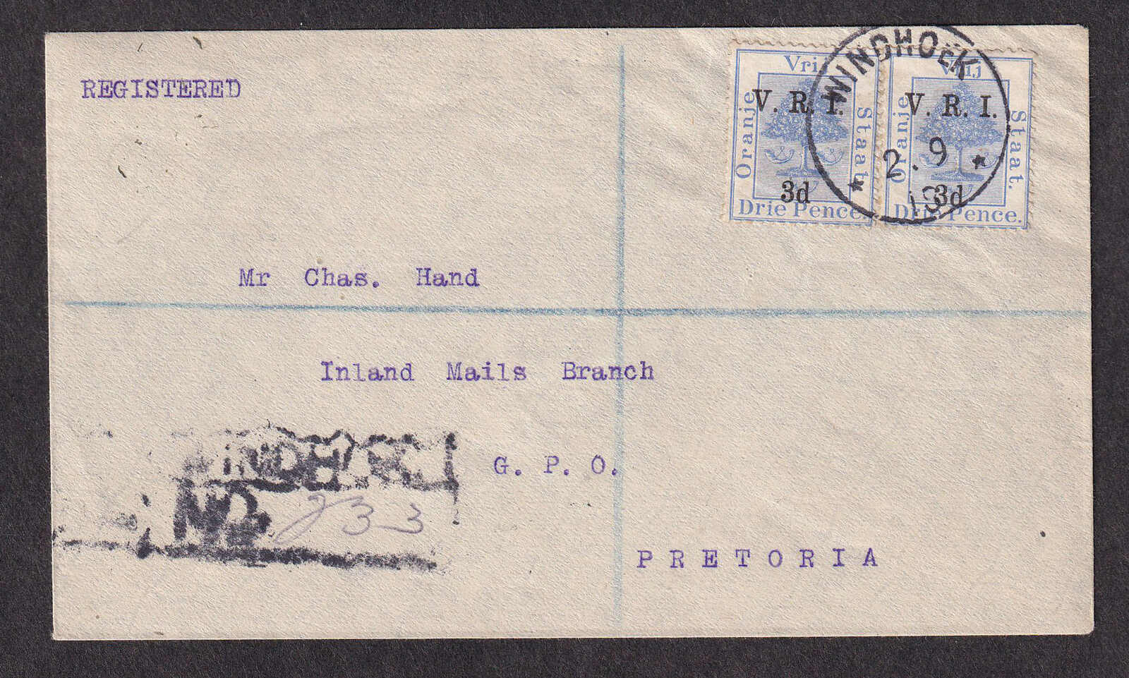 339 CVR   image1918 (December 2), Windhoek to Pretoria, registered cover with Orange Free State franking, two V.R.I. / 3d. surcharged singles, tied to cover by choice Windhoek c.d.s., with handstamped registration marking at lower left, to Pretoria, South Africa, with further Windhoek c.d.s. on reverse, an extremely fresh cover and unusual franking in this period. (Image 1) (Image 2)