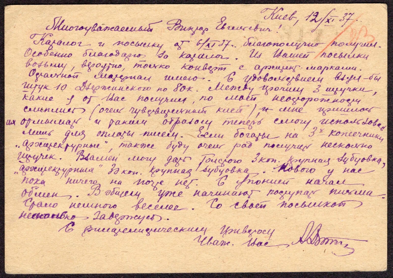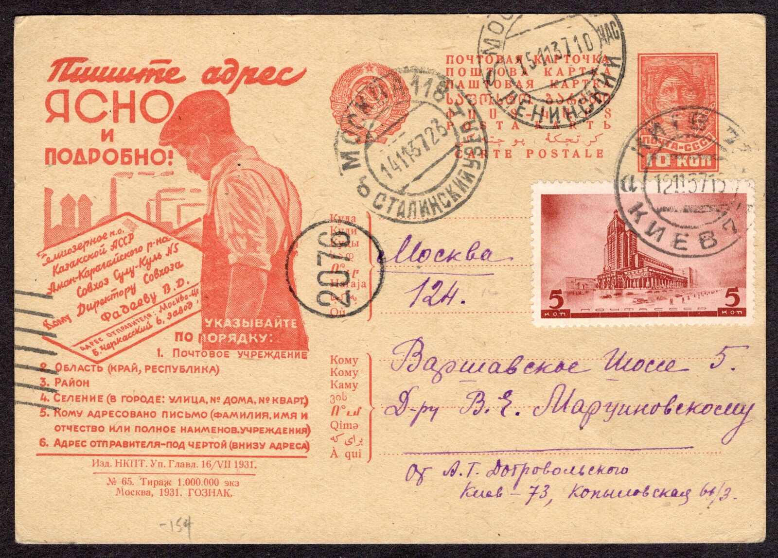 331 CVR   image1937 (12 November), illustrated 10k propaganda postal stationery card, Kiev to Moscow, uprated with 5k “Building of Moscow” definitive, both adhesives tied by bilingual KIEV 12.XI.37 double-circle datestamp, with two further MOSCOW transit strikes on the front, the card printed with the Stalin-era directive “Write the address clearly and in detail!” illustrated by a worker consulting official instructions, a postal propaganda design reflecting the emphasis on discipline and administrative precision during the Great Purge, very fine. (Image 1) (Image 2)
