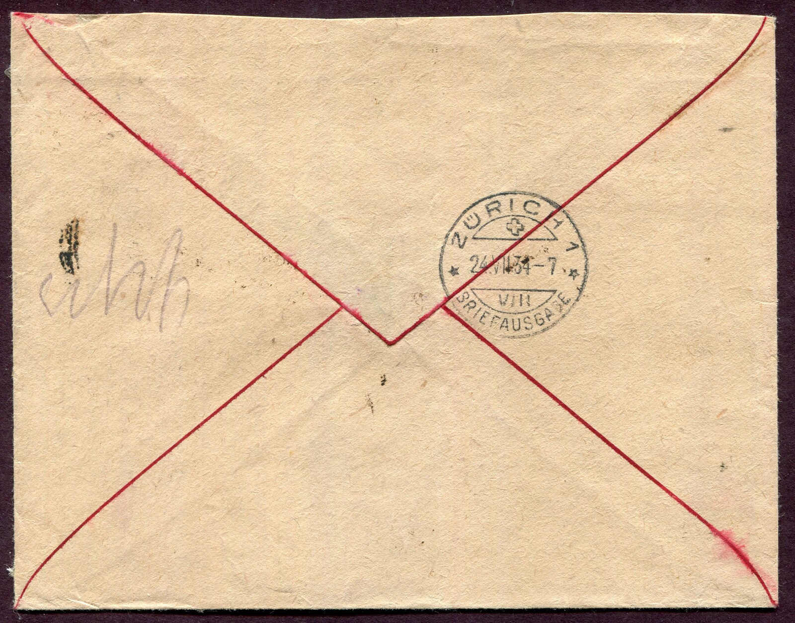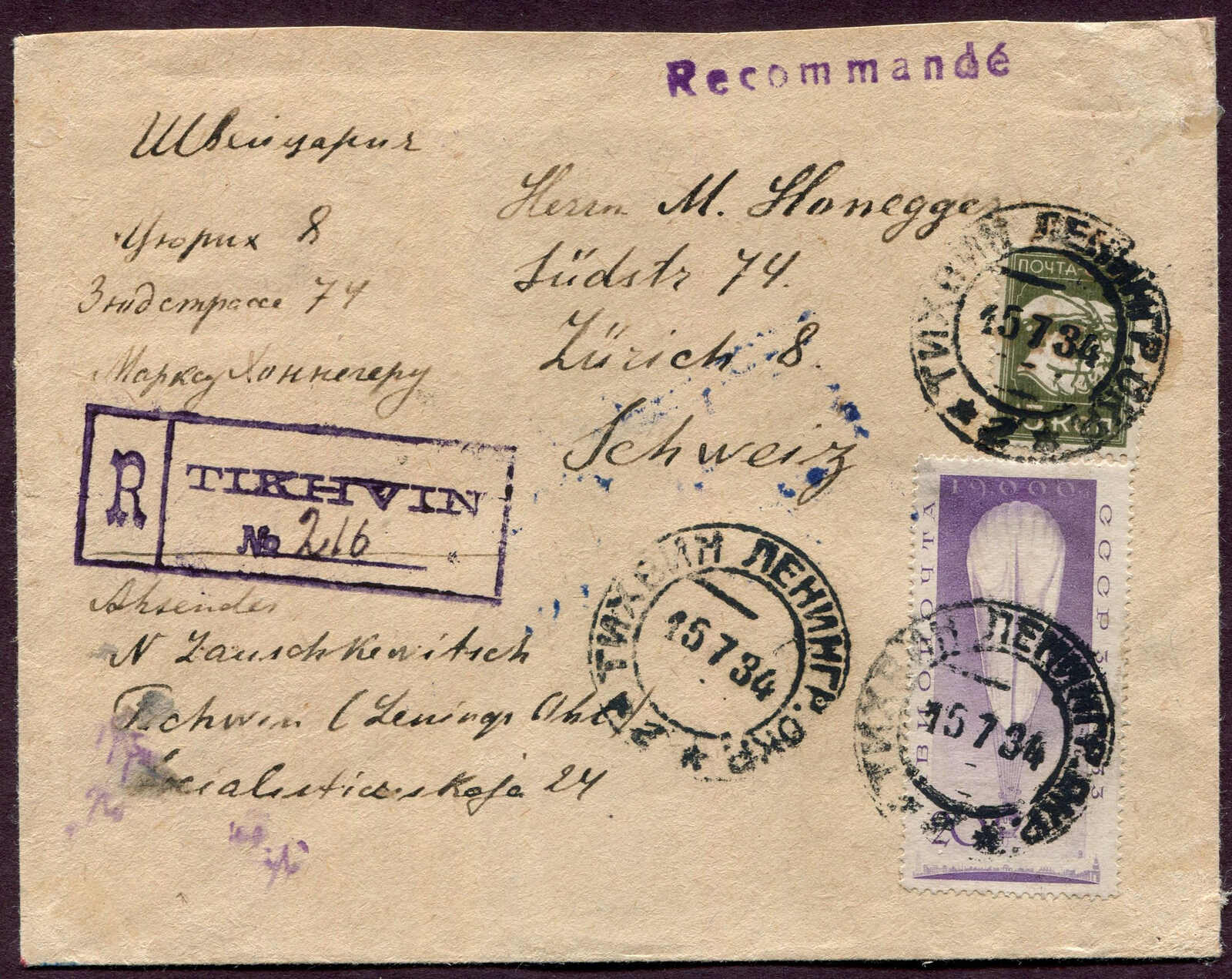330 CVR   image1934 (15 July), registered cover from Tikhvin to Zurich, Switzerland, franked with 15k Worker–Soldier–Peasant definitive and 20k lilac airmail Stratostat, tied by double-circle TIKHVIN LENINGRAD 15.7.34 datestamps, violet boxed R TIKHVIN registration marking on front, reverse with neat ZURICH 1 / 24.VII.34 / BRIEFAUSGABE receiver, a clean and attractive registered foreign usage, very fine. (Image 1) (Image 2)
