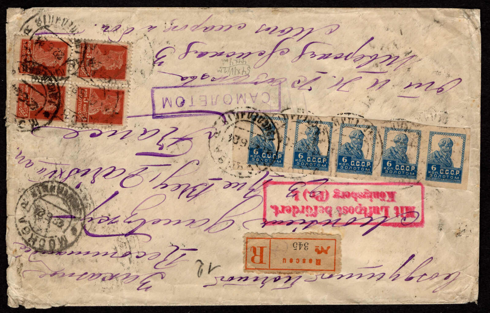 323 CVR   image1924 (May 22), registered airmail cover from Moscow to Paris, with surcharged revenue franking, franked with an imperforate strip of five 6k Worker, several 3k definitive multiples, together with an Imperial 1r fiscal stamp surcharged СССР / УПОЛНОМОЧЕННЫЙ ПО ФИЛАТЕЛИИ И БОНАМ / ЗАГРАНИЧНЫЙ ОБМЕН / 1 КОПЕЙКА ЗОЛОТОМ for authorised postal use, all stamps tied by multiple MOSKVA 22.5.24 double-circle datestamps, the fiscal overprint additionally cancelled by violet boxed control handstamp, front showing boxed violet САМОЛЕТОМ (By Airplane) and red Moscow registration label, red German Mit Luftpost befördert Königsberg (Pr) 1 transit, reverse with clear PARIS 27.5.24 receiver, minor edge wear and paper faults from handling, otherwise a spectacular high-franking Soviet airmail usage with a genuine postal use of the fiscal surcharge, fine and highly desirable. (Image 1) (Image 2)