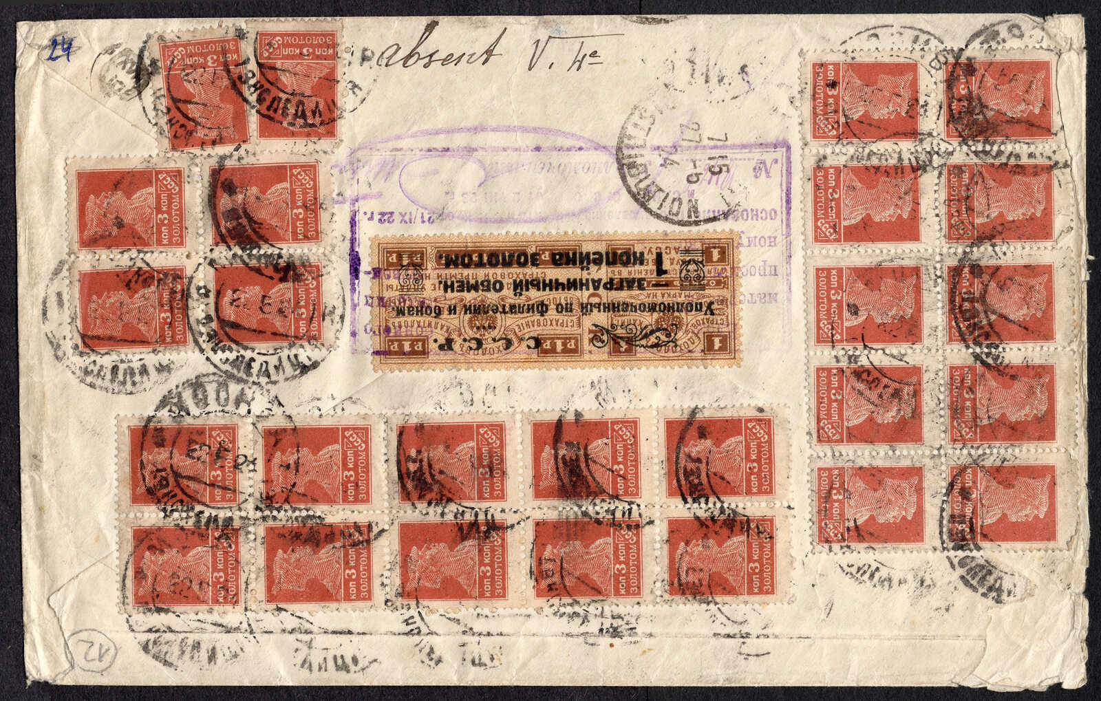 321 CVR   image1922 (June 10), registered inflation cover from Pohrebyshche, Kiev Guberniya to Germany, franked on front and reverse with twenty-six examples of the 7 500r on 250r blue imperforate, together with 200r brown and 300r green singles, the combined franking amounting to 195 500 roubles, all tied by clear Pohrebyshche / Kiev G. (10 Jun) circular datestamps, with manuscript and handstamped registry notations, some creasing, but a striking franking and small-town Ukrainian origin. (Image 1) (Image 2)