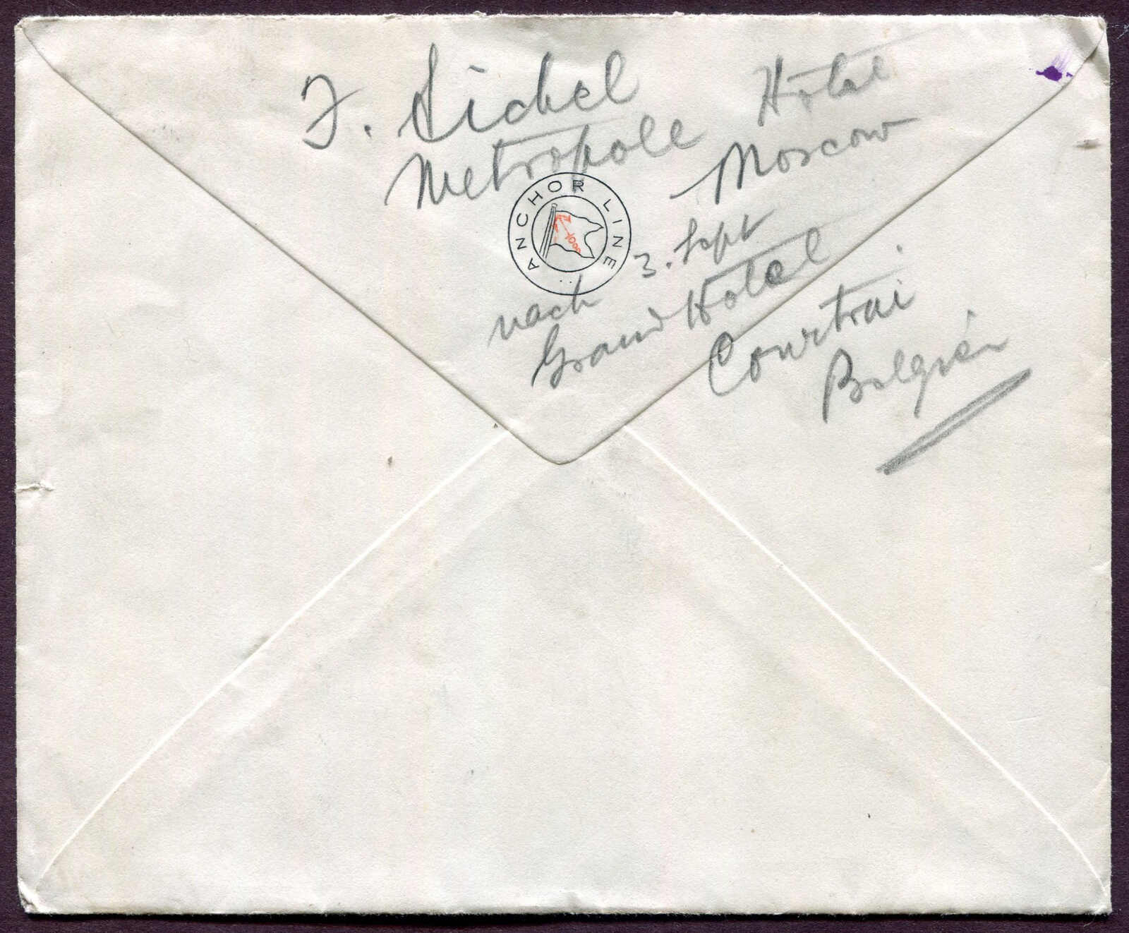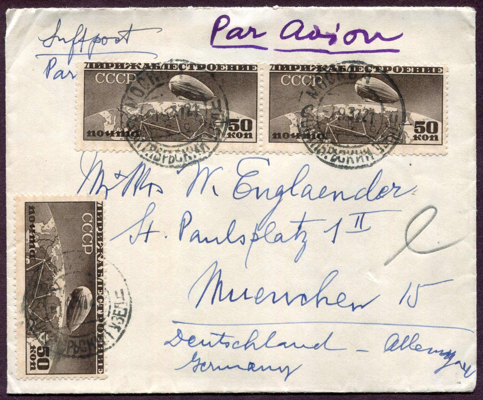 333 CVR   image1937 (September 1), Zeppelin airmail cover from Moscow to Munich, Germany, franked with a pair and single of the 50k brown Airship Exploring Arctic Regions issue, tied by three clear strikes of the black double-circle MOSKVA 1.9.37 datestamp, manuscript endorsements Luftpost / Par Avion at upper left, reverse with sender’s manuscript details and an illustrated Anchor Line ship logo, an attractive commercial usage of the Zeppelin issue. (Image 1) (Image 2)
