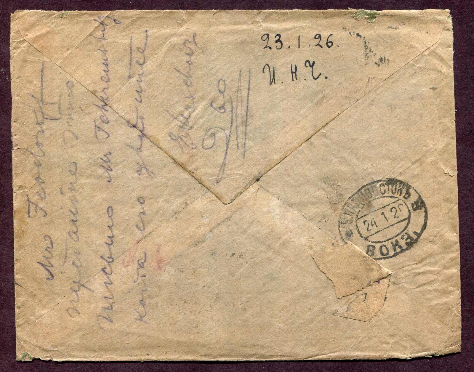325 CVR   image1926 (January 23), registered cover from Vladivostok to Shanghai, China, with NEP-period contents, franked with a pair of 14k Worker definitives tied by oval double-circle VLADIVOSTOK 23.1.26 datestamps, reverse with VLADIVOSTOK VOKZAL 24.1.26 railway transit, front struck with a crisp bilingual Shanghai (9 Feb) receiver, minor surface scuffing to cover front and one adhesive slightly affected, with contents consisting of a multi-page Russian letter dated 23 January 1926 describing food shortages, high bread and meat prices, and daily hardship under the New Economic Policy, some flaws, but a scarce Vladivostok–Shanghai registered cover with fascinating contents. (Image 1) (Image 2) (Image 3) (Image 4) (Image 5) (Image 6) (Image 7) (Image 8) (Image 9)