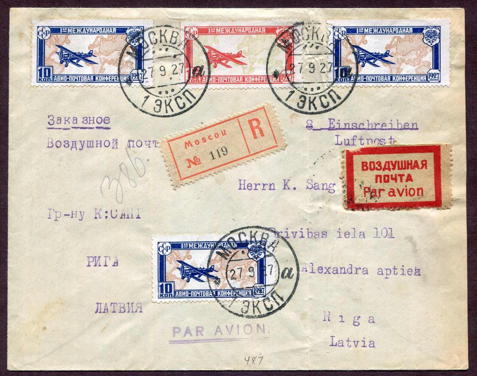 326 CVR   image1927 (September 27), registered airmail cover from Moscow to Riga, Latvia, franked with three 10k blue and one 20k red Airplane over Map of the World commemoratives for the 1st International Air Post Congress at The Hague, all stamps tied by MOSKVA 27.9.27 1 ЭКСП double-circle datestamps, with red Moscow registration label, red bilingual Par Avionetiquette, and typed bilingual routing inscriptions, reverse showing MOSKVA transit (29 Sep) and Riga receiver, a clean and attractive Congress franking to the Baltics, fine-very fine and scarce. (Image 1) (Image 2)