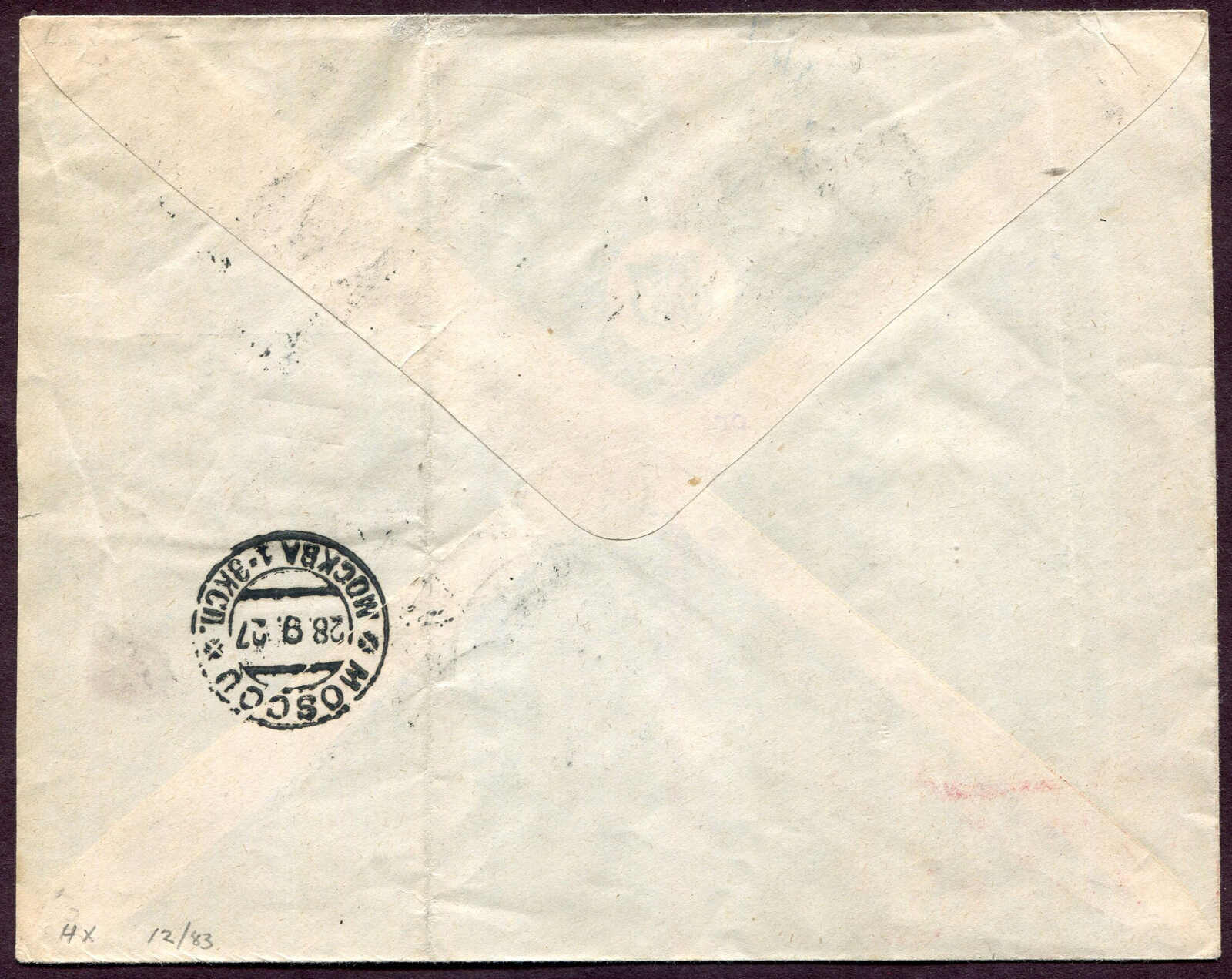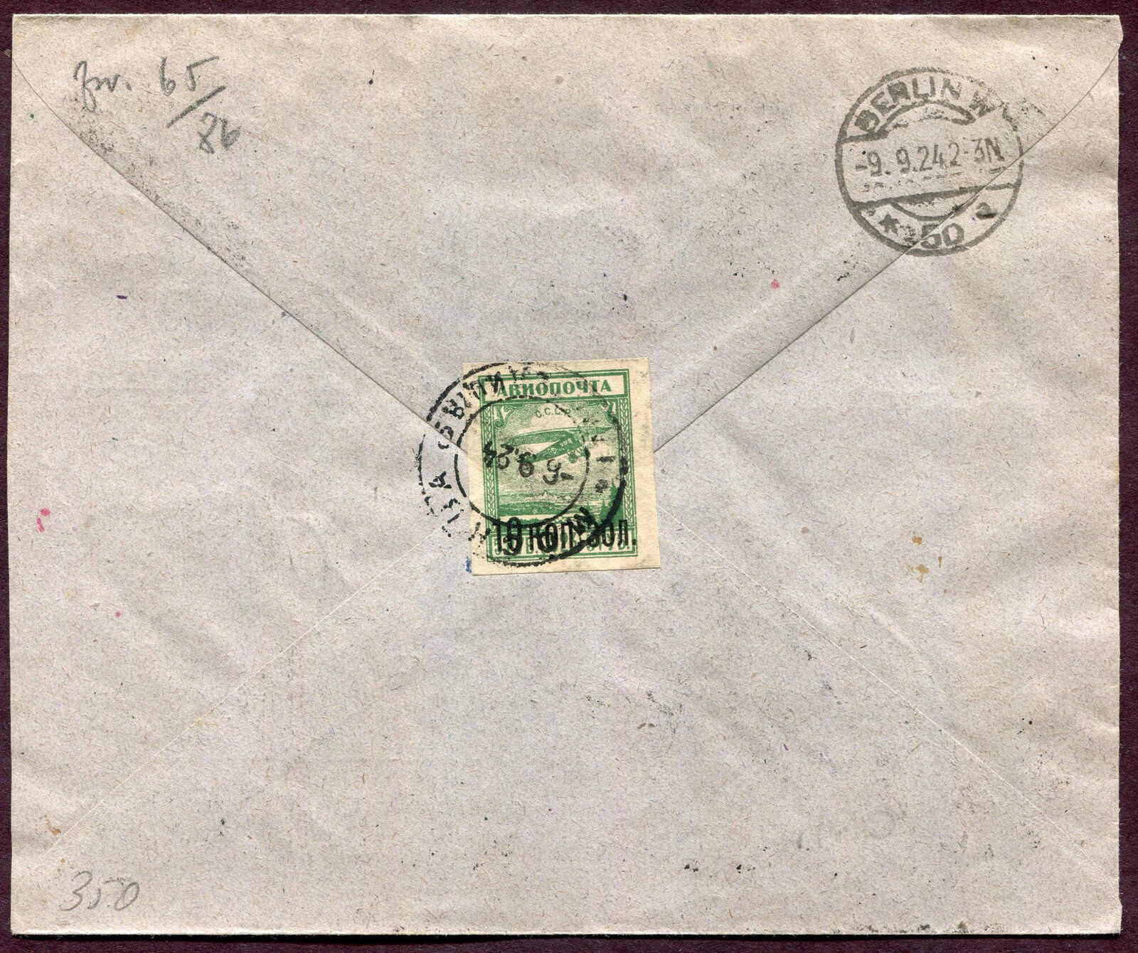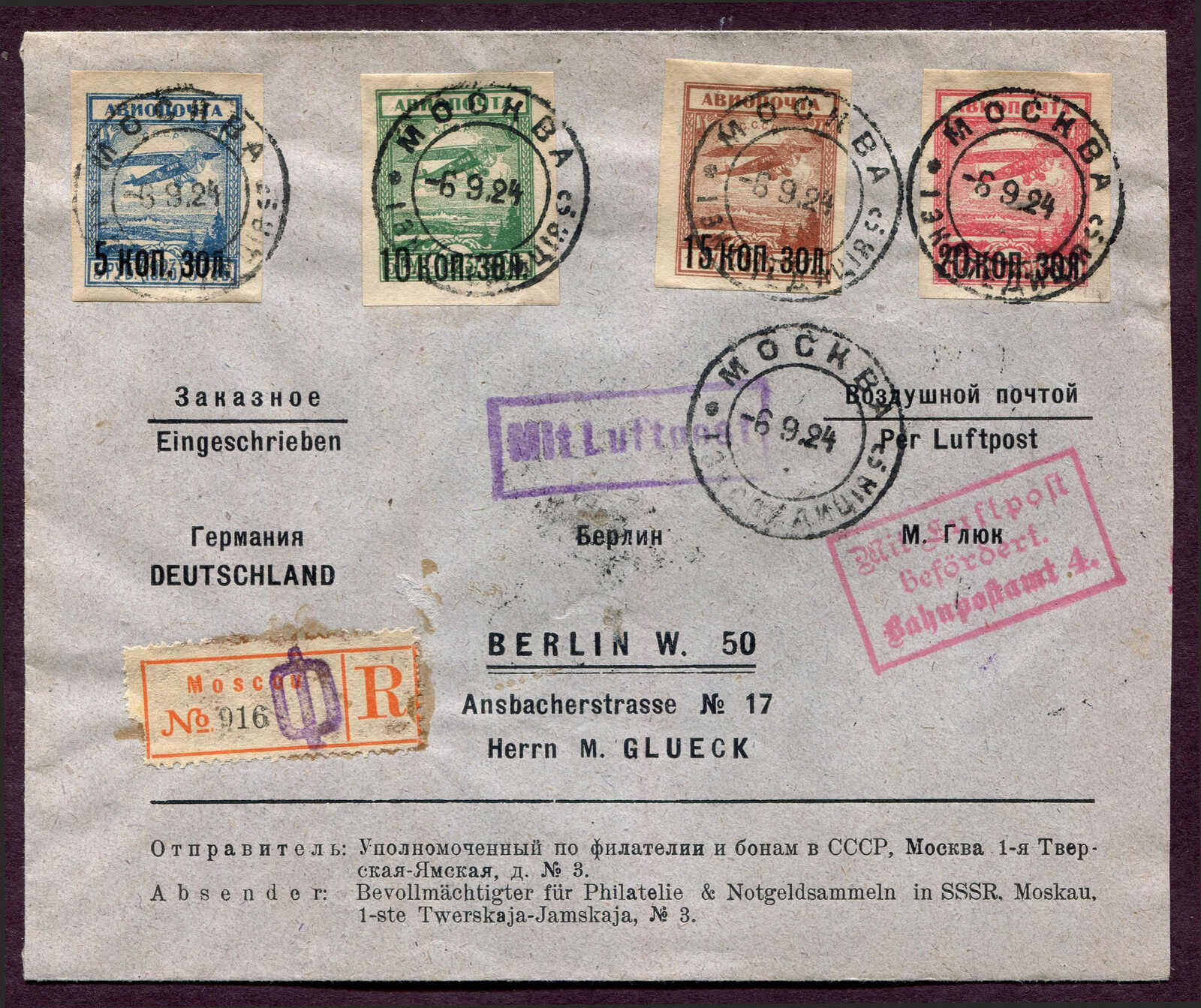 324 CVR   image1924 (6 September), registered airmail cover from Moscow to Berlin, franked with complete imperforate surcharge airmail set, with an additional 10k adhesive on reverse, all tied by clear black double-circle Moscow 6.9.24 datestamps, with red Moscow registration label and violet boxed Mit Luftpost / Per Luftpost handstamp, further confirmed by red boxed German Mit Luftpost befördert. Bahnpostamt 4. marking, reverse struck with Berlin (9 Sep) receiver, an attractive franking, very fine. (Image 1) (Image 2)
