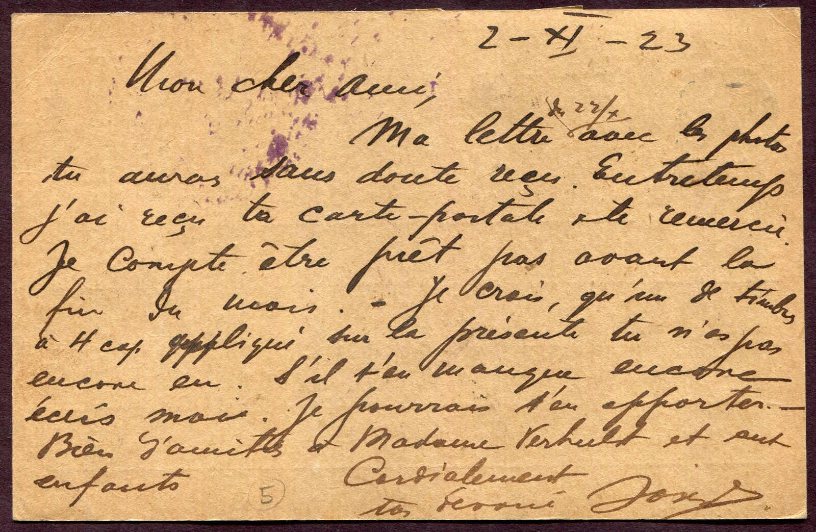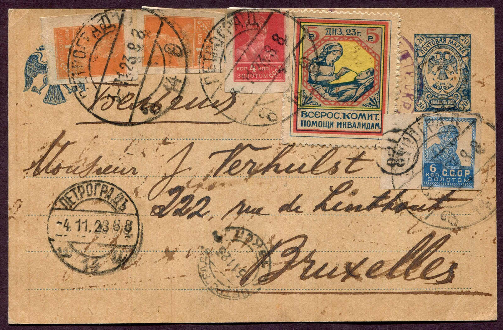 322 CVR   image1923 (November 3), charity label on postal stationery card from Petrograd (St. Petersburg) to Brussels, Belgium, 20k stationery uprated with 1k pair, 4k and 6k imperforate Worker issues, together with a 5r All-Russian Committee for Aid to Invalids charity label inscribed “Всерос. Комит. помощи инвалидам” and dated “ДНЗ 23г.”, the adhesives and charity label tied by three clear Petrograd (3 Nov) datestamps, with additional transits on front, the message referencing shortages and delays typical of early Soviet recovery after the Civil War, a fine foreign-destination usage with this elusive charity label. (Image 1) (Image 2)