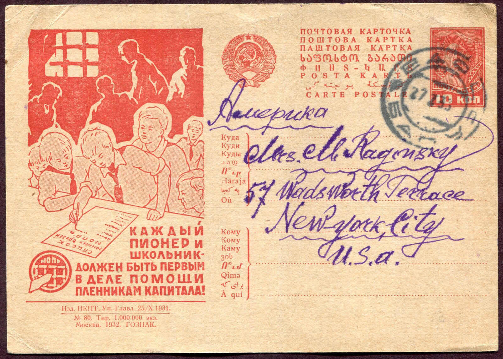 328 CVR   image1932 (18 July), propaganda postal stationery card from Baku (Azerbaijan) to New York, United States, 10k red Worker postal stationery card bearing a vivid propaganda illustration showing children writing petitions, captioned “Every Pioneer and Schoolchild must be first in helping the prisoners of Capital!”, the indicium tied by a clear Baku (18 Jul 32) bilingual c.d.s., with New York (8 Aug) receiver alongside, a desirable example from present-day Azerbaijan. (Image 1) (Image 2)