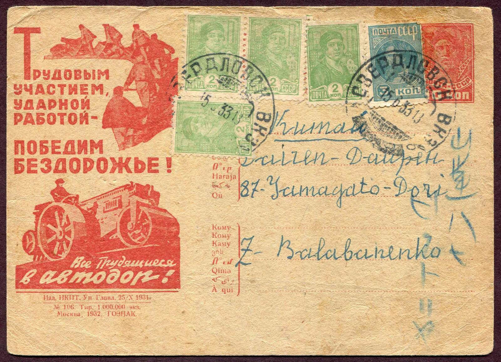 329 CVR   image1933 (15 June), propaganda postal stationery card from Sverdlovsk to Kumamoto, Japan, 10k red “Defeat impassable roads – join Avtodor!” postal stationery card, uprated with four 2k and one 3k Worker definitives, all tied by two clear single-circle Sverdlovsk Vokzal 15.6.33 datestamps, addressed to Kumamoto, Japan, a notably scarce destination, the printed design at left shows workers operating heavy machinery with slogan “Through labour participation and shock work – we will overcome impassable roads! Everyone must join Avtodor!”, reflecting the industrial road-building campaign of the First Five-Year Plan, light ageing consistent with handling, a fine propaganda usage to an uncommon interwar destination. (Image 1) (Image 2)