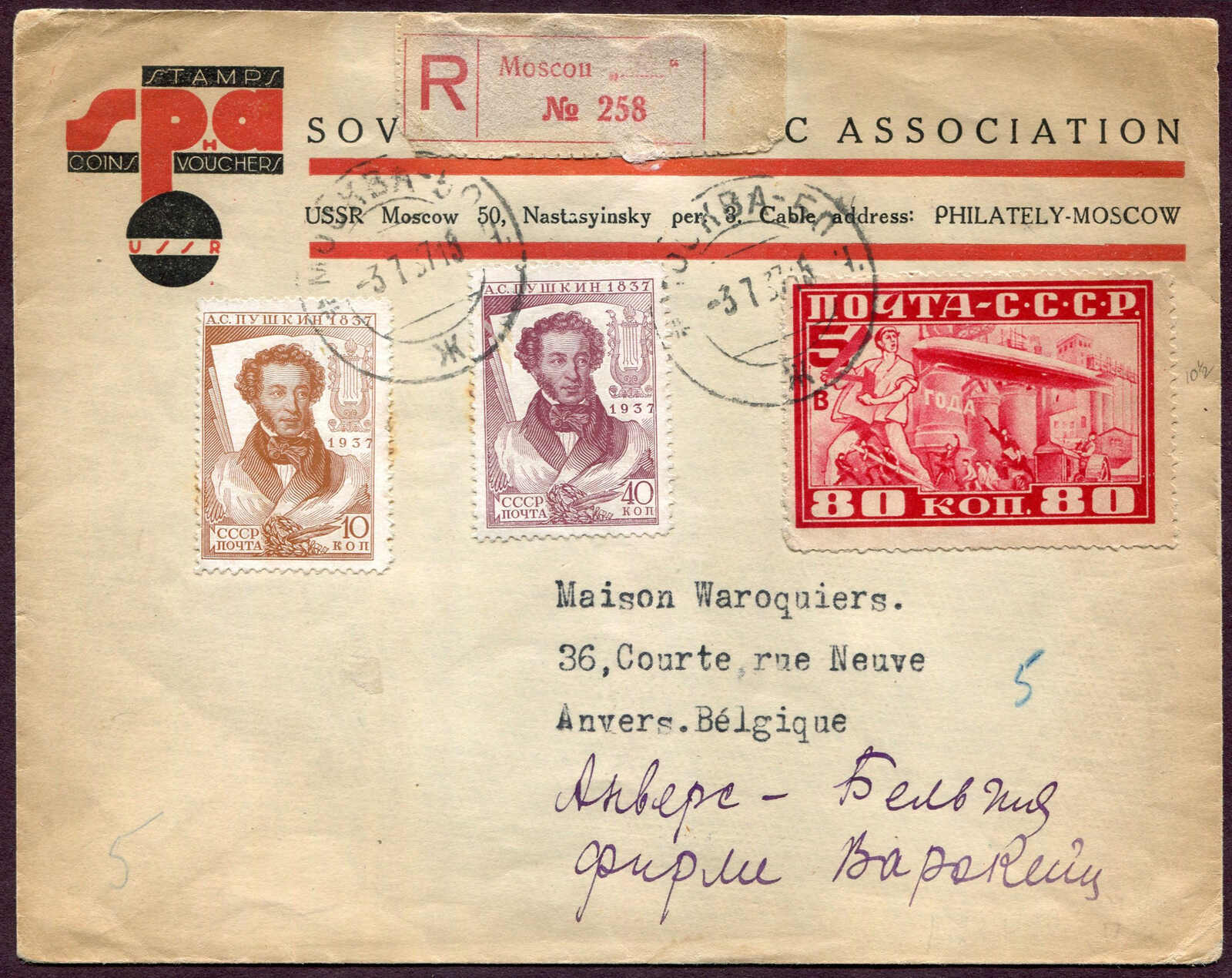 332 CVR   image1937 (3 July), registered cover from Moscow to Antwerp, Belgium, Soviet Philatelic Association printed envelope franked with the 80k Graf Zeppelin propaganda issue together with 10k and 40k Pushkin commemoratives, all tied by two clear black double-circle Moscow 3.7.37 datestamps, with red Moscow registration label at upper left; addressed to Maison Waroquiers, Antwerp, a fine usage of the Zeppelin issue which, created to commemorate Soviet–German Zeppelin cooperation, typical minor edge toning, else fine-very fine. (Image 1)