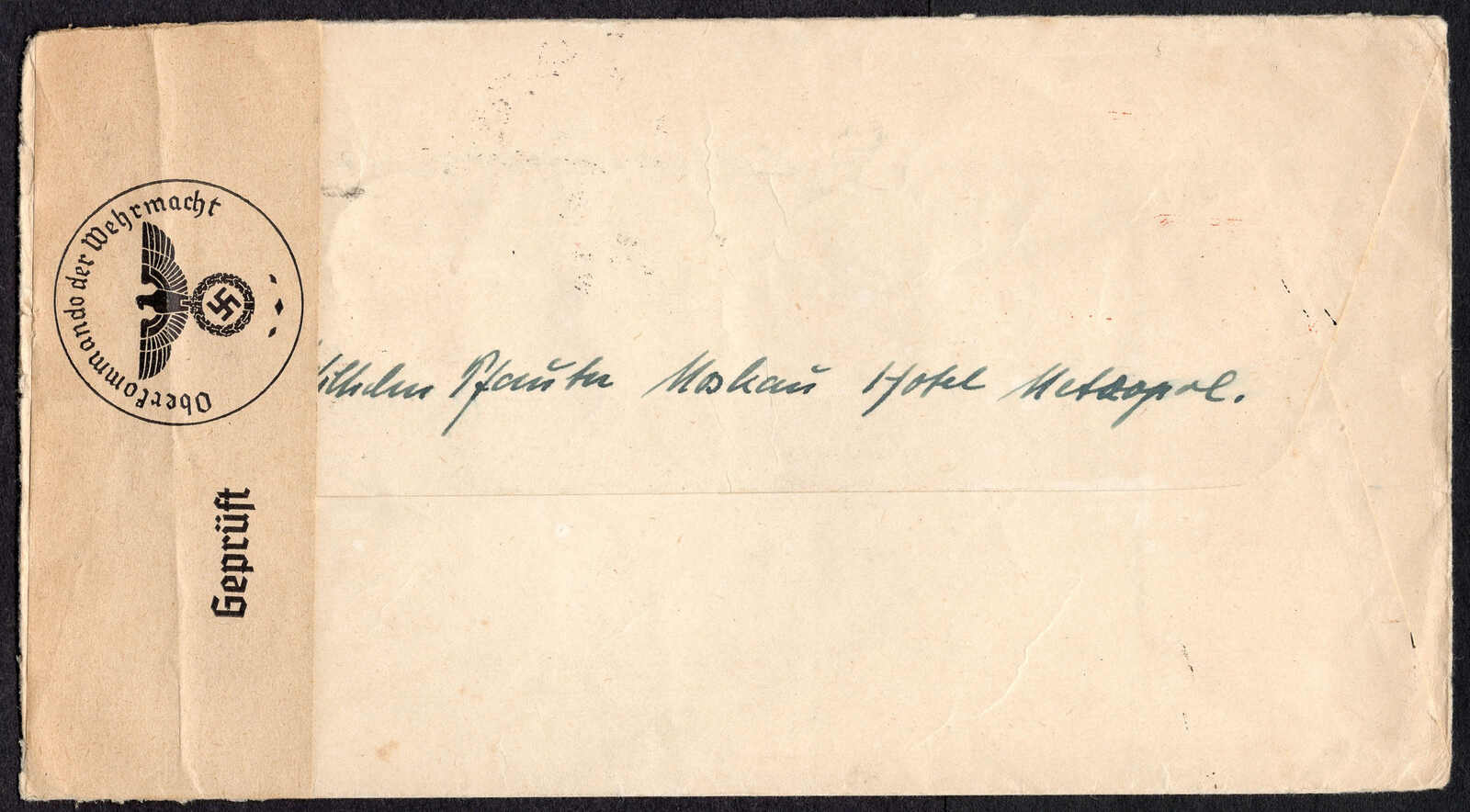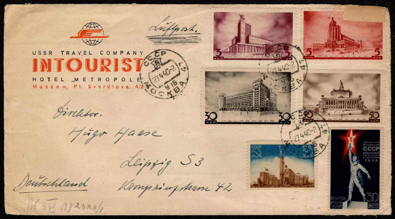 334 CVR   image1940 (27 April), World War II censored airmail cover from Moscow to Leipzig, with INTOURIST Hotel Metropole corner card, franked with a striking mixed franking comprising 3k, 5k, 30k and 50k First Congress of Soviet Architects values together with the 50k “State of USSR Pavilion” and 30k “USSR Pavilion at the New York World’s Fair” commemoratives, all tied by three clear Moscow (27 Apr) single-circle datestamps, manuscript Luftpost endorsement at top confirming airmail carriage, reverse with intact German Wehrmacht censor tape handstamped with eagle-and-swastika Geprüft marking, a striking cover, carried across the Soviet–German border just over a year before Operation Barbarossa, light handling only, very fine. (Image 1) (Image 2)